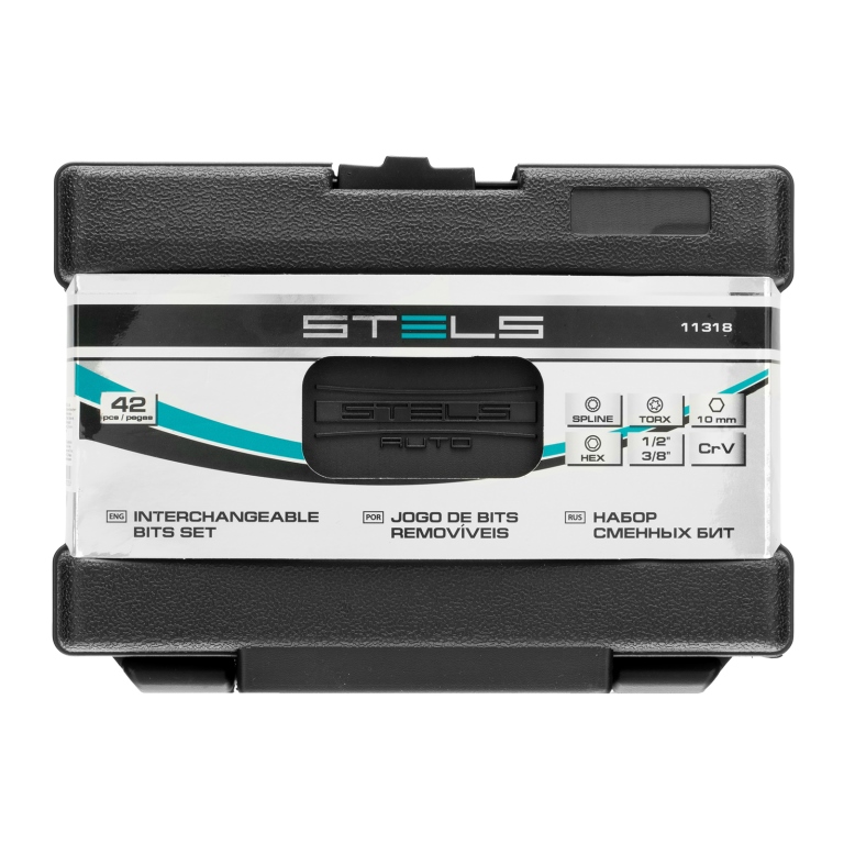 Набор Stels 11318 включает 42 предмета: биты с шестигранным хвостовиком 3/8 дюйма, из стали CrV, предназначенные для крепления 6-гранных саморезов, винтов, шурупов HEX, «звезд» TORX и 12-лучевых SPLINE, а также 2 переходника 1/2-3/8 дюйма и 3/8-3/8 дюйма. Биты устанавливают на ключ-трещотку, пневмотрещотку или пневматический гайковерт. Комплект рекомендован для профессионального применения в автомастерских и на производствах автомобилей.