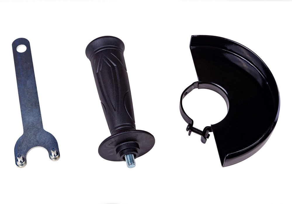 - Гайки для крепления диска, комплект щеток, дополнительная рукоятка, ключ, защитный кожух в комплекте.