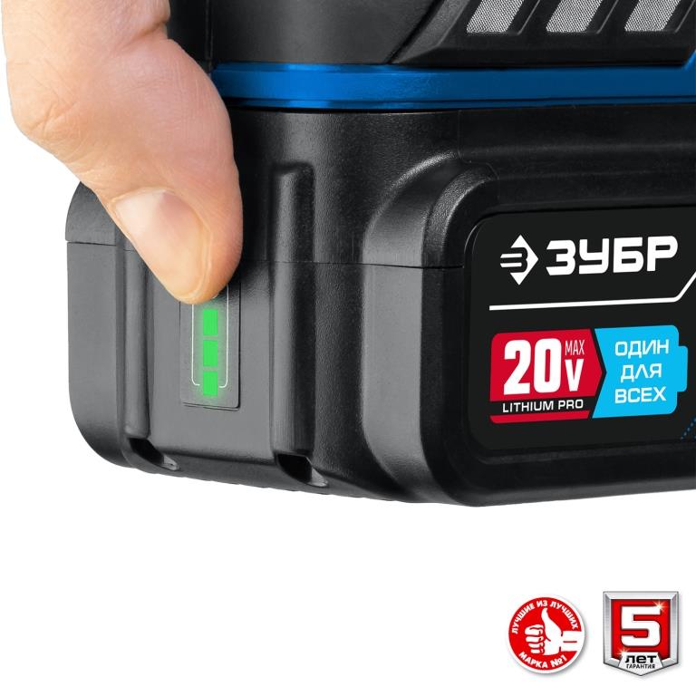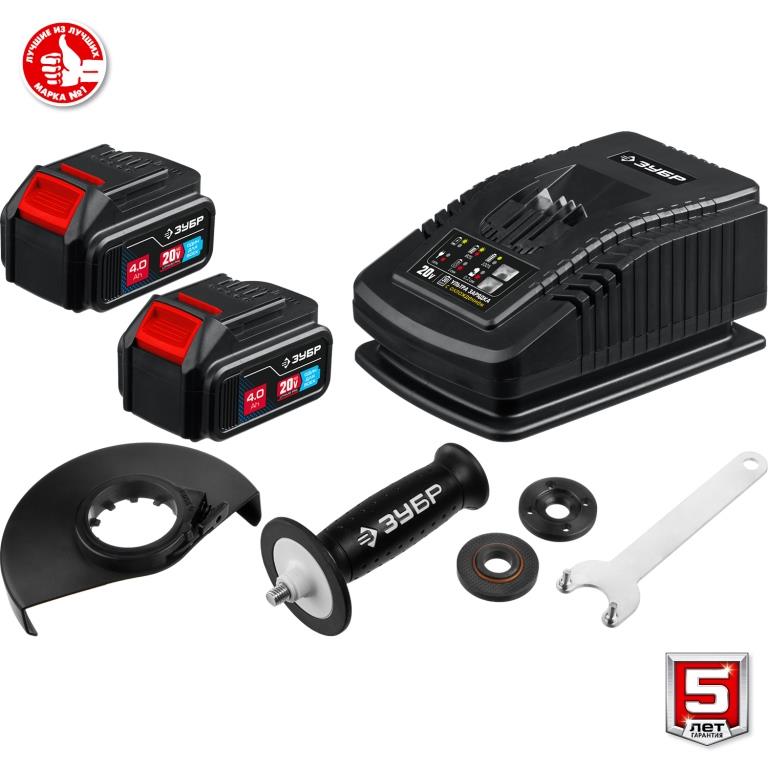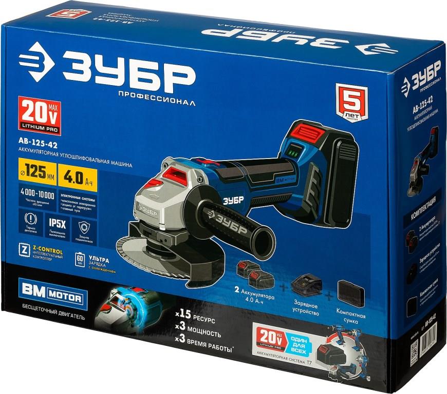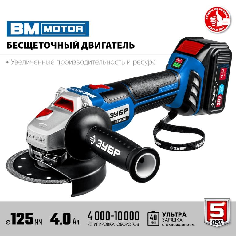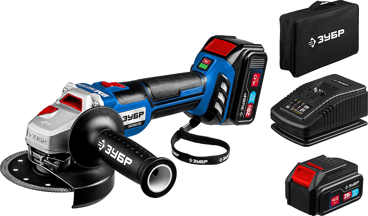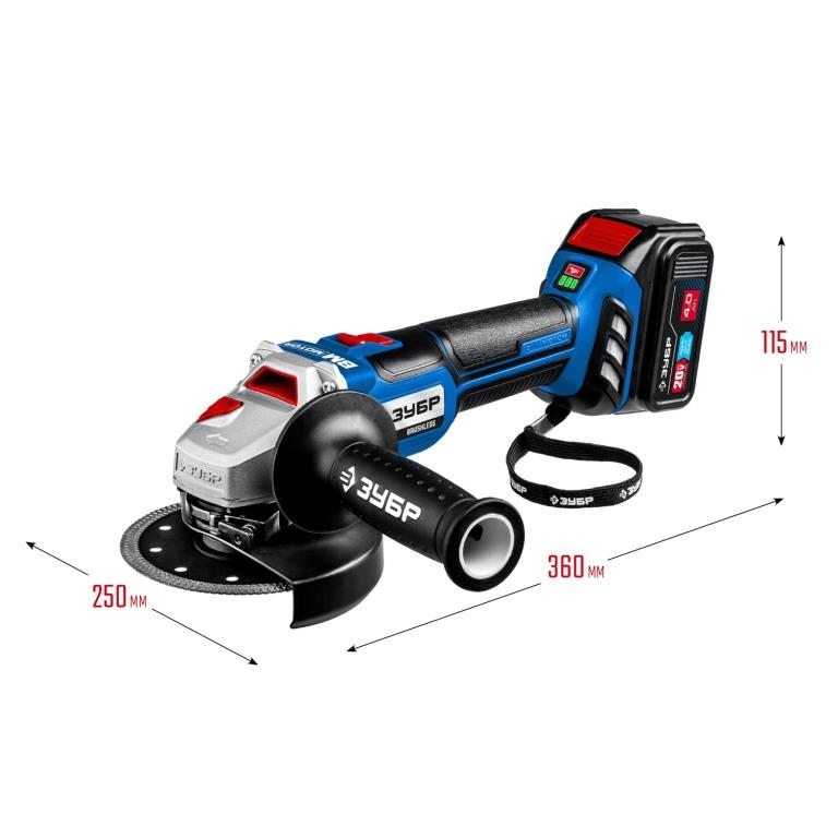 Угловая шлифовальная машина ЗУБР 20В бесщеточная УШМ, 2 АКБ (4Ач), в сумке, Профессионал AB-125-42