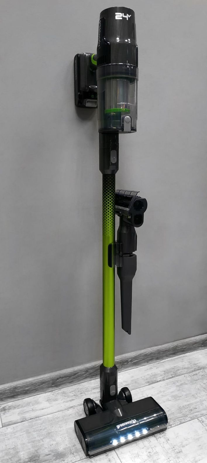Вертикальный беспроводной аккумуляторный пылесос премиум-класса Greenworks G24SVK4 из серии 24V 4700607 (500 Вт) имеет расход воздуха 21 л/с, контейнер 0,5 л, LED-дисплей и 5 различных насадок в комплекте. Оснащен бесщеточным двигателем мощностью 500 Вт.