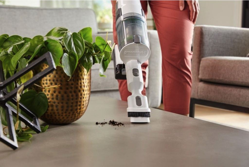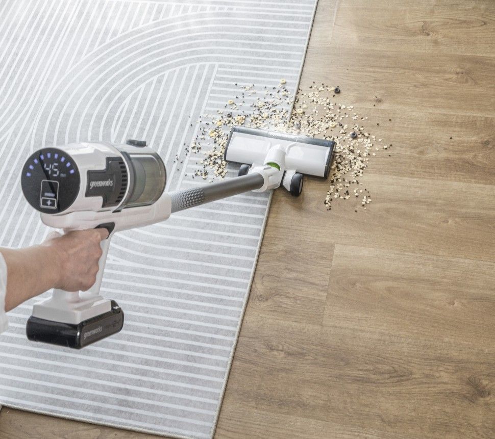 Вертикальный беспроводной аккумуляторный пылесос премиум-класса Greenworks G24SVK4D из серии 24V 4701107 (500 Вт) имеет расход воздуха 21 л/с, контейнер 0,5 л, LED-дисплей и 5 различных насадок в комплекте. Оснащен бесщеточным двигателем мощностью 500 Вт.