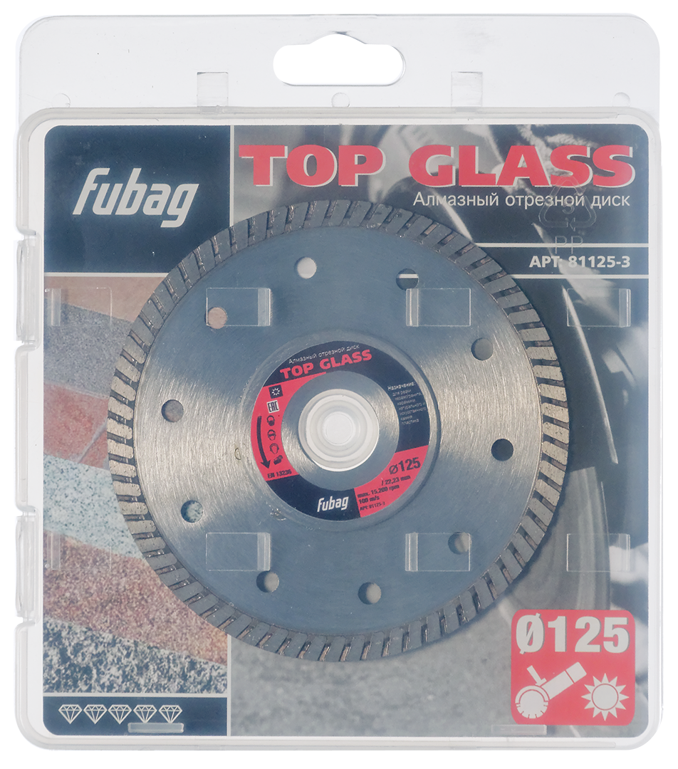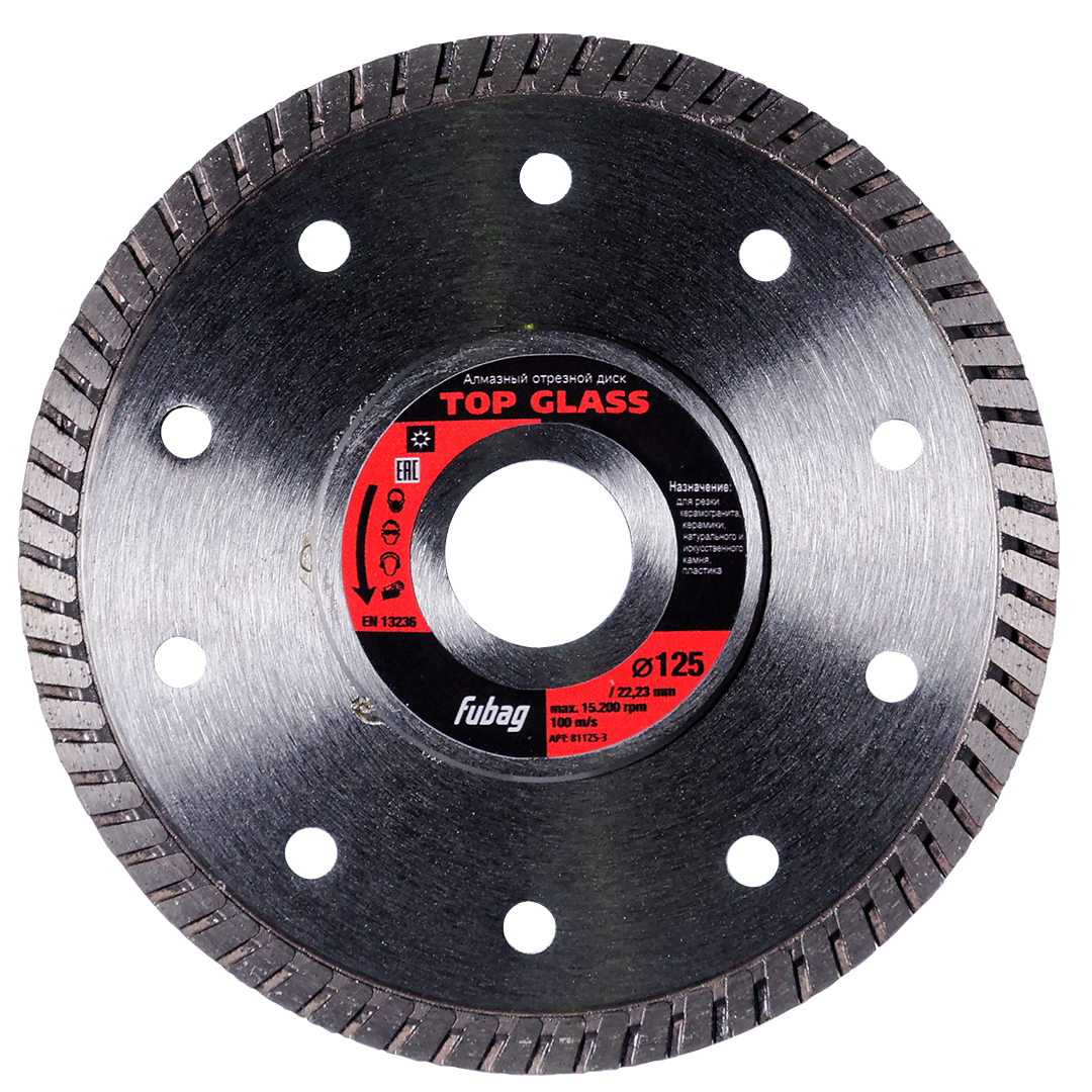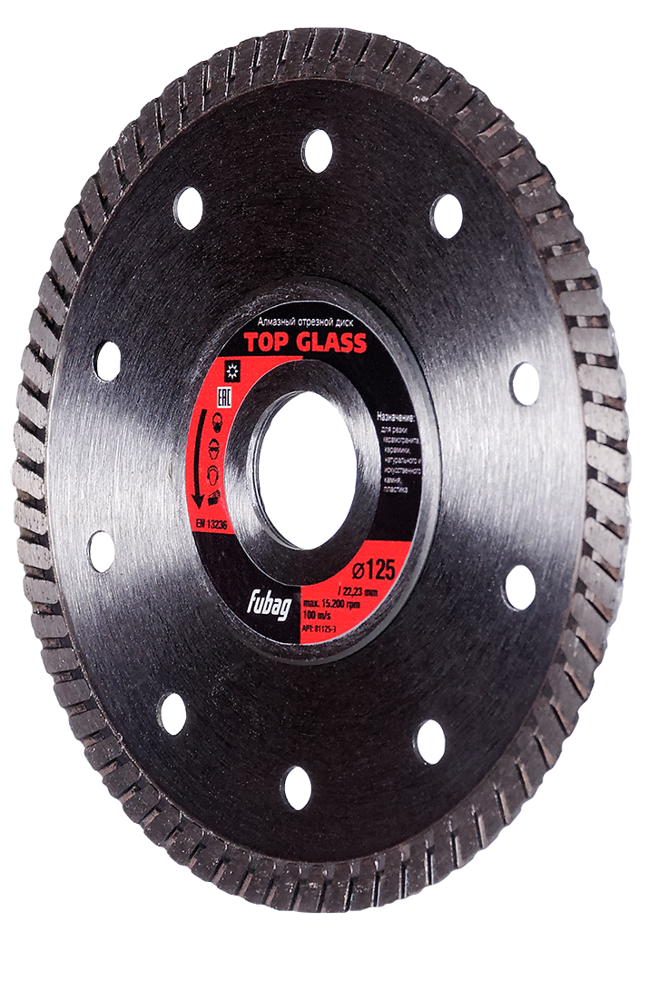 Алмазный отрезной диск для керамогранита с турбо режущей кромкой диаметром 125 мм и посадочным отверстием 22.2 мм. Рекомендован для резки такого материала как: керамогранит, керамика, натуральный и искусственный камень, пластик.