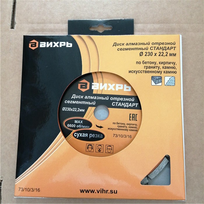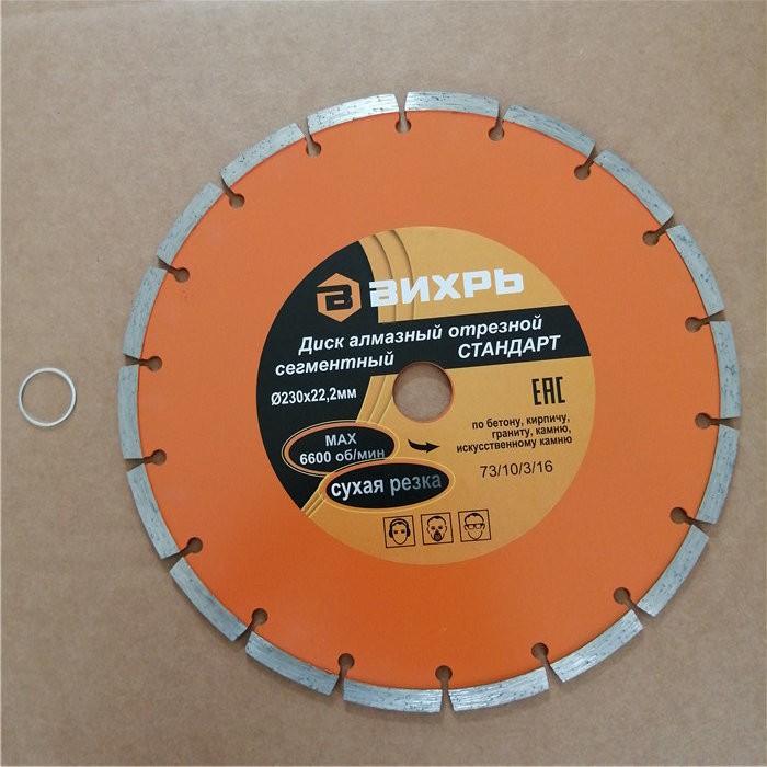 Диск алмазный отрезной сегментный СТАНДАРТ, 230 х 22,2 мм, сухая резка Вихрь - это алмазный отрезной диск, который используется совместно с угловыми шлифмашинами (болгарками) для сухой резки гранитных, бетонных, кирпичных и каменных изделий.