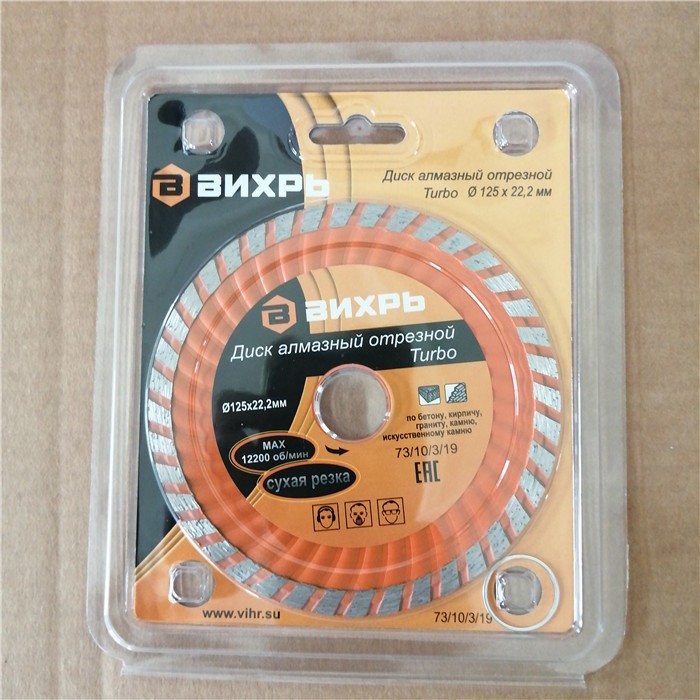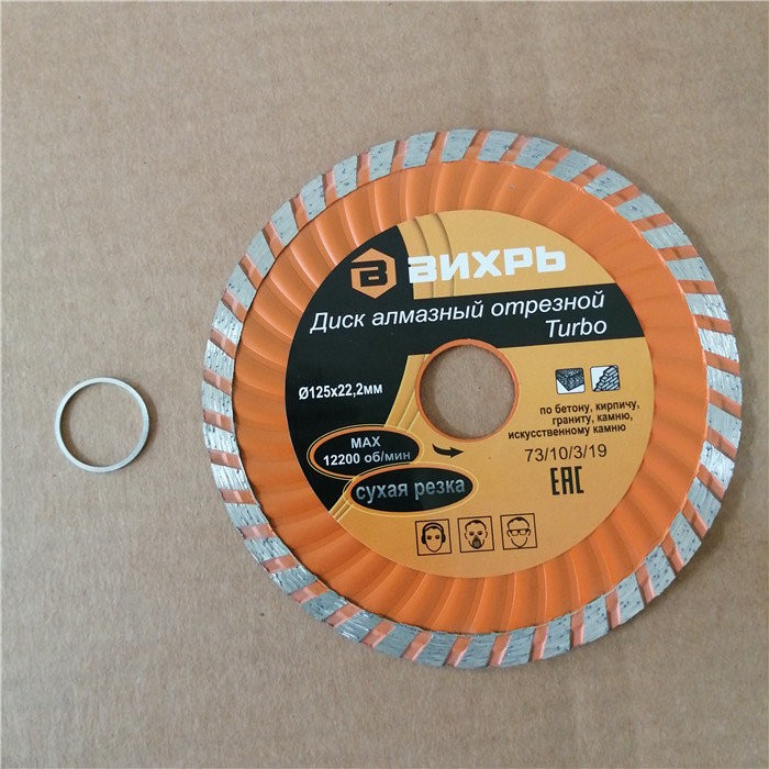 Диск алмазный отрезной Турбо 125 х 22,2 мм, сухая резка Вихрь - это алмазный отрезной диск, который используется совместно с угловыми шлифмашинами (болгарками) для сухой резки гранитных, бетонных, кирпичных и каменных изделий.