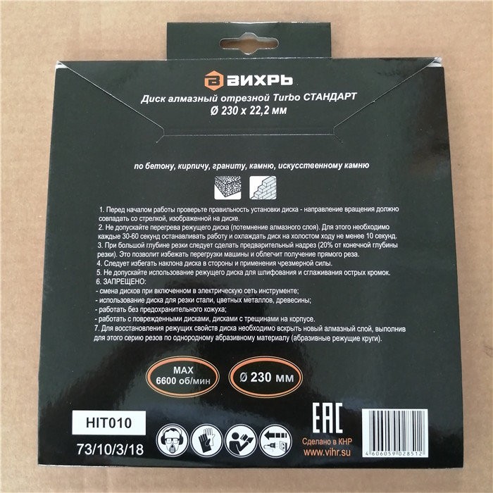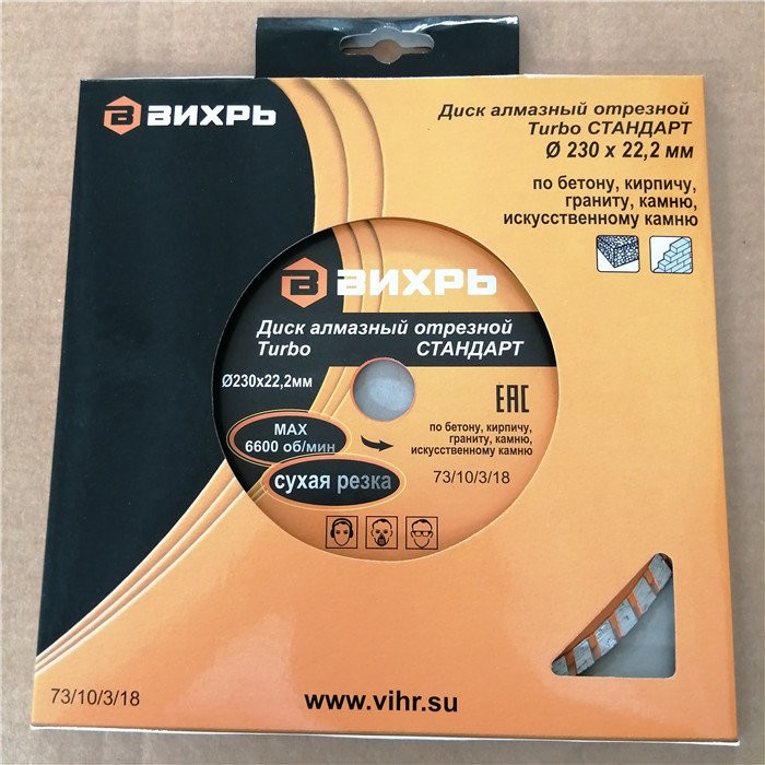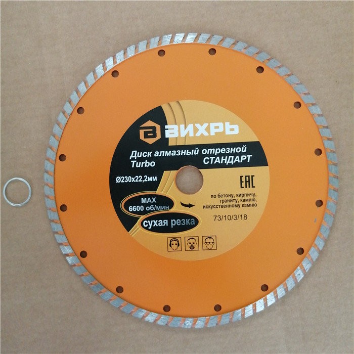 Диск алмазный отрезной Турбо СТАНДАРТ, 230 х 22,2 мм, сухая резка Вихрь - это алмазный отрезной диск, который используется совместно с угловыми шлифмашинами (болгарками) для сухой резки гранитных, бетонных, кирпичных и каменных изделий.