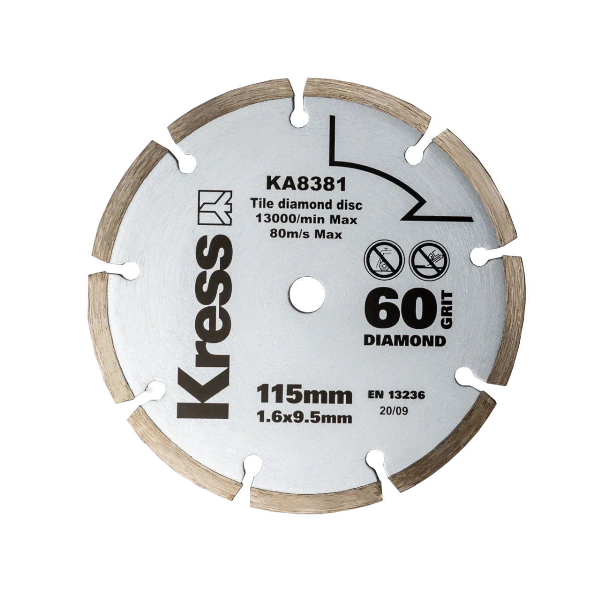 Диск с алмазным напылением для резки абразивных материалов. Диаметр диска — 115 мм, посадочный диаметр — 9,5 мм, толщина диска — 1,6 мм. Подходит для циркулярной пилы KU436P.