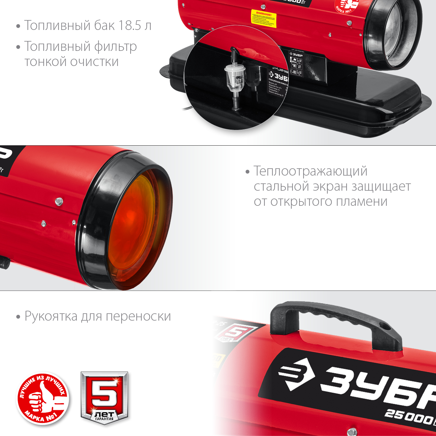 Высокоэффективный дизельный теплогенератор прямого нагрева работающий на дизельном топливе для всех климатических условий. Оптимально подходит для сушки и прогрева на строительных площадках складских комплексов и проветриваемых помещений. Надежный поджиг и эффективное горение гарантируют безотказную подачу тепла в любых условиях эксплуатации. ЗУБР - тепло всегда и везде