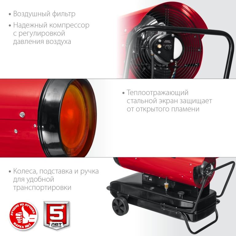 Высокоэффективный дизельный теплогенератор прямого нагрева работающий на дизельном топливе для всех климатических условий. Оптимально подходит для сушки и прогрева на строительных площадках складских комплексов и проветриваемых помещений. Надежный поджиг и эффективное горение гарантируют безотказную подачу тепла в любых условиях эксплуатации. ЗУБР - тепло всегда и везде