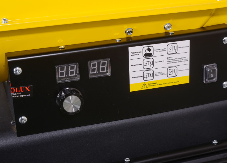 Теплопушка Eurolux ТДП-EU-20000 оснащена колёсами и удобной ручкой, поэтому перемещение её сложностей не вызывает. Для исключения перегрева агрегата в его конструкции реализована система термозащиты. От угасания пламени защищает система на основе фотодетектора. Когда он фиксирует отсутствие пламени, система отключает агрегат. Вес тепловой пушки – 16.2 кг.