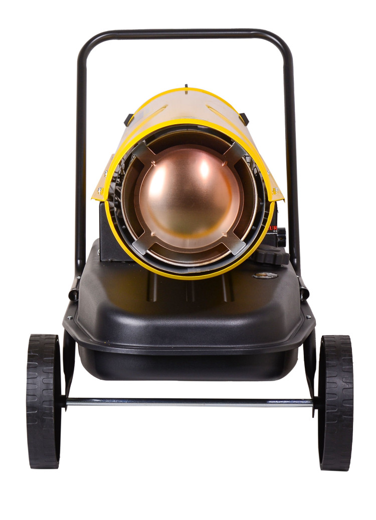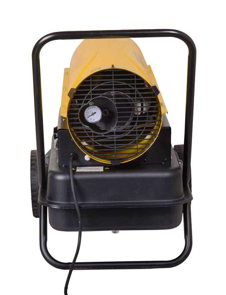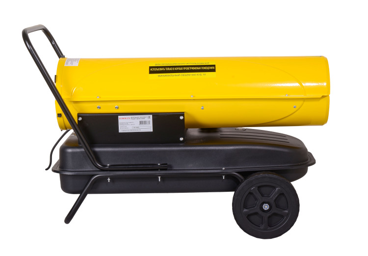 Теплопушка работает на дизельном топливе, расход составляет 2,37 кг/ч. Емкость топливного бака – 36 л, на одном баке устройство может работать в течение 12 ч. Производительность 1400 м³/ч позволяет устройству быстро достигать нужной температуры и поддерживать ее на заданном уровне необходимое количество времени. Модель с прямым нагревом подходит для ангаров, складов, производственных цехов, других крупных помещений, но ее не рекомендуется использовать для жилых комнат. Установка оснащена терморегулятором, с помощью которого можно подбирать оптимальный для каждого объекта температурный режим. Наличие дисплея упрощает процесс контроля над показателями температуры во время эксплуатации агрегата. Дизельная теплопушка имеет термозащиту на случай перегрева. При угасании пламени дизельная тепловая пушка также автоматически отключится. Устройство весит 18,8 кг. Для удобства установки и перемещения оно оснащено колесами и опорами, а также высокой ручкой.