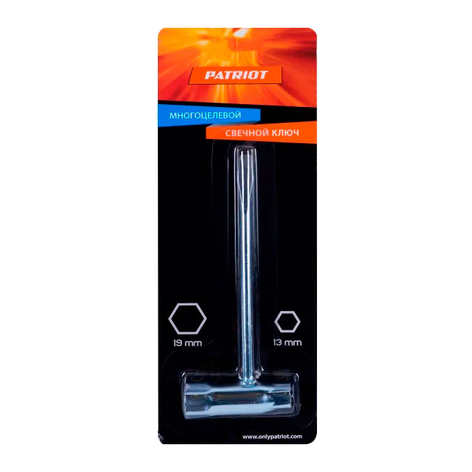 Универсальный свечной ключ PATRIOT для проведения технического обслуживания свечей зажигания в двух или четырехтактных двигателях садовой техники, силовой и строительной техники. Инструмент включает в себя две торцевые головки диаметром 13 мм и 19 мм, а также плоскую отвертку.