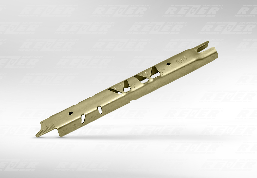 - калибр для контроля углов заточки цепи, для регулировки высоты зуба, ограничивающего глубину реза, а также для чистки направляющего паза и смазочного отверстия пильной шины;