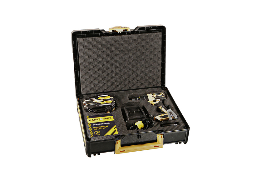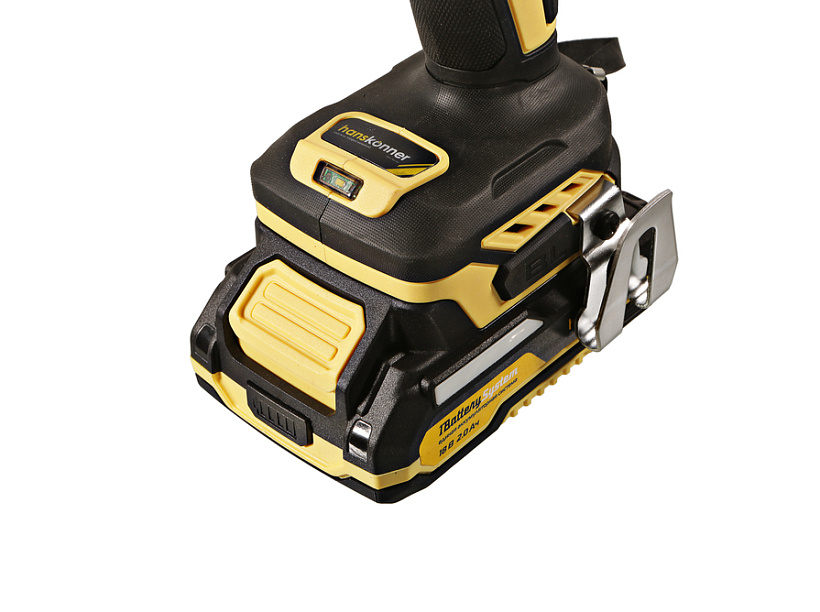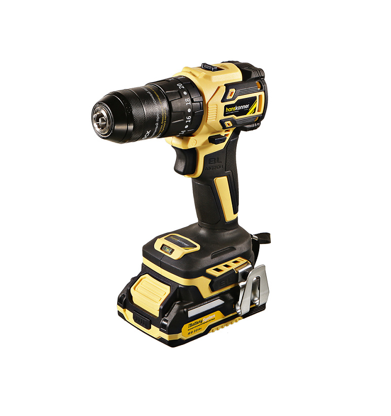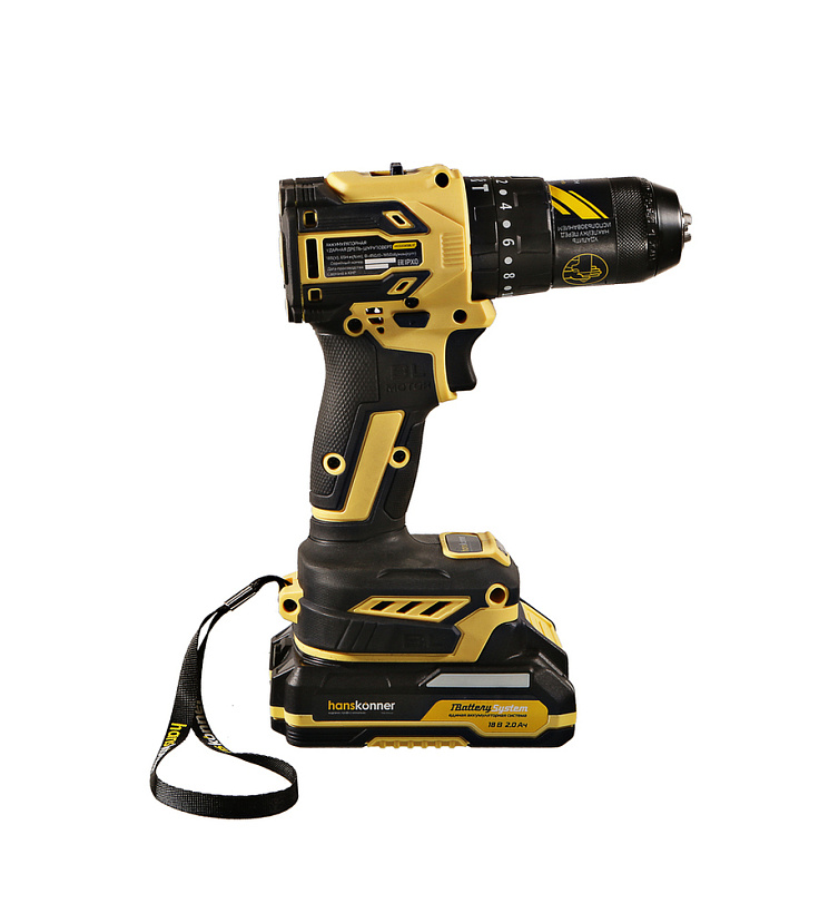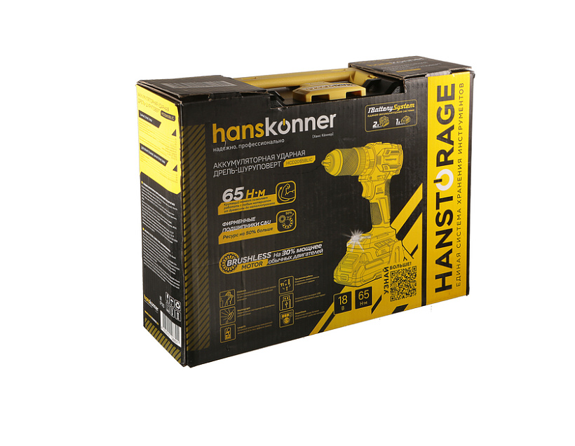 Hanskonner HCD2065BLIС – аккумуляторный 18 В, ударный, двухскоростной шуруповерт – является частью системы 1BatterySystem, обеспечивающей совместимость одного и того же аккумулятора с целым рядом наименований инструмента. Модель обладает максимально сбалансированной компоновкой: небольшие размеры корпуса и рукояти позволяют эффективное использование инструмента в условиях с затрудненным доступом, а нейтральный центр тяжести, и обилие прорезиненных противоскользящих поверхностей способствуют надежному хвату, и лучшему контролю в процессе работы. Шуруповерт оснащен 18 В бесщеточным двигателем, характеризующимся на 30% лучшей производительностью в сравнении с коллекторными аналогами. Кроме того, бесщеточный двигатель отлично справляется с кратковременными перегрузками и не склонен к перегреву. Благодаря применению мощного планетарного механизма High Torque Technology, Hanskonner HCD2065BLIС обладает высоким показателем максимального крутящего момента, достигающего 65 Н м. Имеет две скорости: режим пониженных оборотов (0 – 450 об/мин) предназначен для работ с крепежом, режим повышенных оборотов (0 – 1650 об/мин) – для сверления отверстий в различных материалах. Важная отличительная черта Hanskonner HCD2065BLIC – наличие ударного механизма, значительно расширяющего возможности устройства при сверлении отверстий в кирпичной кладке, штукатурке, керамике, легком бетоне и неплотном камне. Усиленный цельнометаллический патрон c муфтой ClickLock и максимальным диаметром захвата 13 мм обеспечивает надежность фиксации, и расширяет набор применяемой оснастки для выполнения работ с повышенной нагрузкой. Предусмотрена функция блокировки вала, способствующая удобству смены оснастки одной рукой. К особенностям Hanskonner HCD2065BLIC стоит отнести электронный тормоз выбега двигателя, гарантирующий мгновенную остановку патрона, эффективную LED-подсветку рабочей зоны WorkingLight с блоком коллиматорных линз, создающих направленный симметричный луч, а также индикатор остаточного заряда аккумулятора PowerCheck. Дополнительному комфорту использования способствуют специальная зацепная скоба крепления на пояс и страховочный ремешок на руку. Шуруповерт штатно комплектуется парой литий-ионных (Li-ion) аккумуляторов емкостью 2.0 А ч, с возможностью подзарядки от них через USB выход cторонних гаджетов, импульсным зарядным устройством с функцией быстрой зарядки (0 – 100% – 50 мин), USB LED-фонарем, запитываемым от АКБ, двухсторонней битой. Прочный кейс единой системы хранения инструмента HANSTORAGE гарантирует сохранность устройства и аксессуаров в процессе транспортировки.