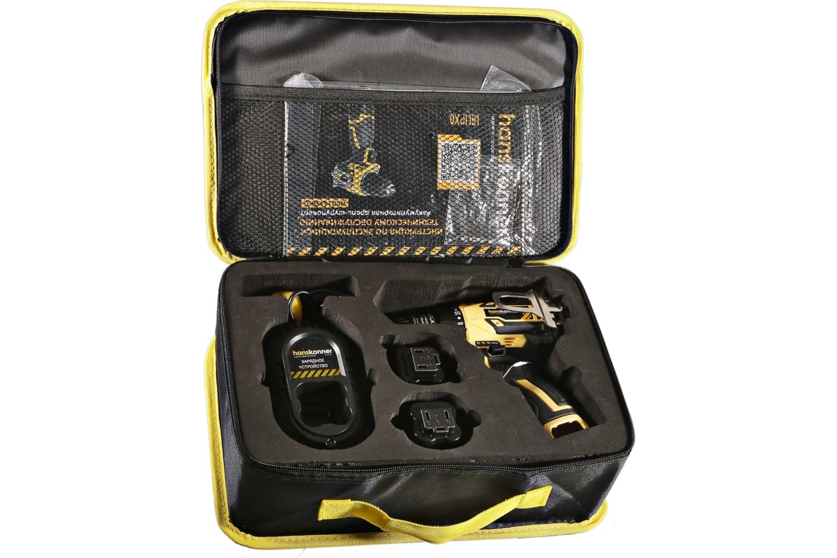 Шуруповерт Hanskonner HCD1645BLC поставляется с двумя сменными аккумуляторами 2.0 Ач и зарядным устройством в сумке-кейсе.