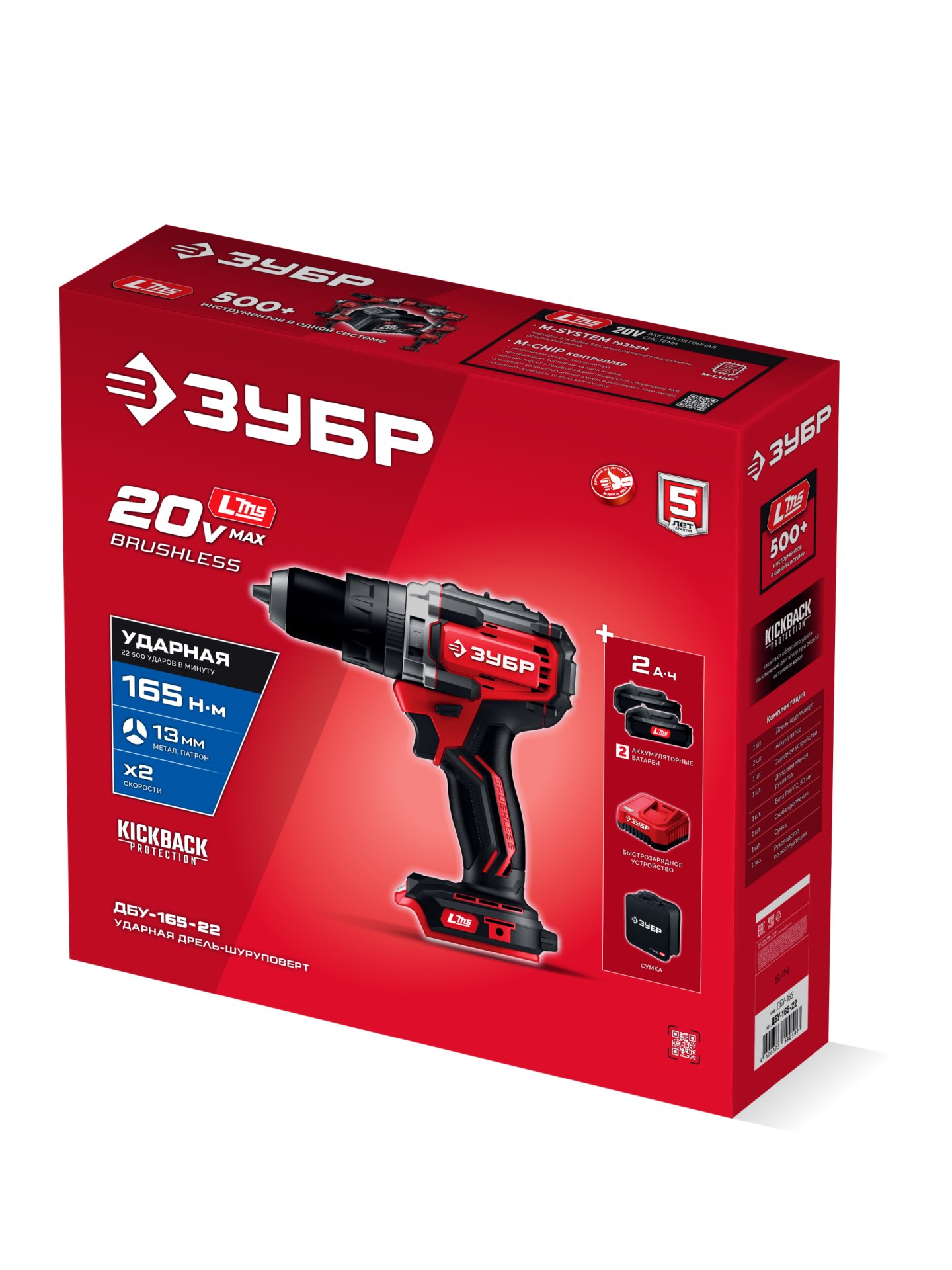 Бесщеточная ударная дрель-шуруповерт ЗУБР 20 В, 165 Н·м, 2 АКБ LMS (2 А·ч)