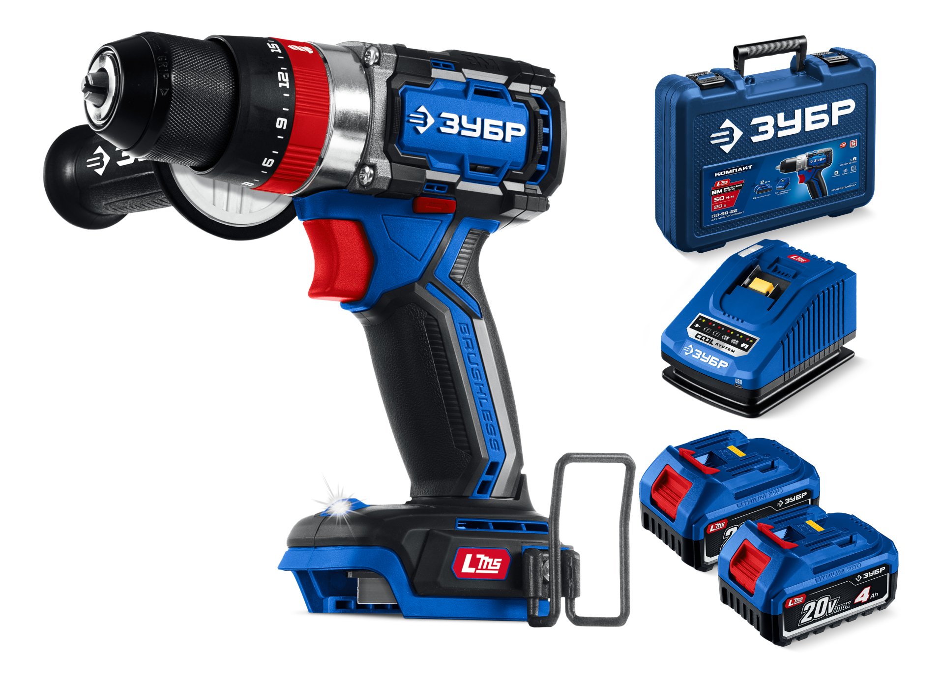 Бесщеточная ударная дрель-шуруповерт ЗУБР 20 В, 70 Н·м, 2 АКБ LMS (4 А·ч)