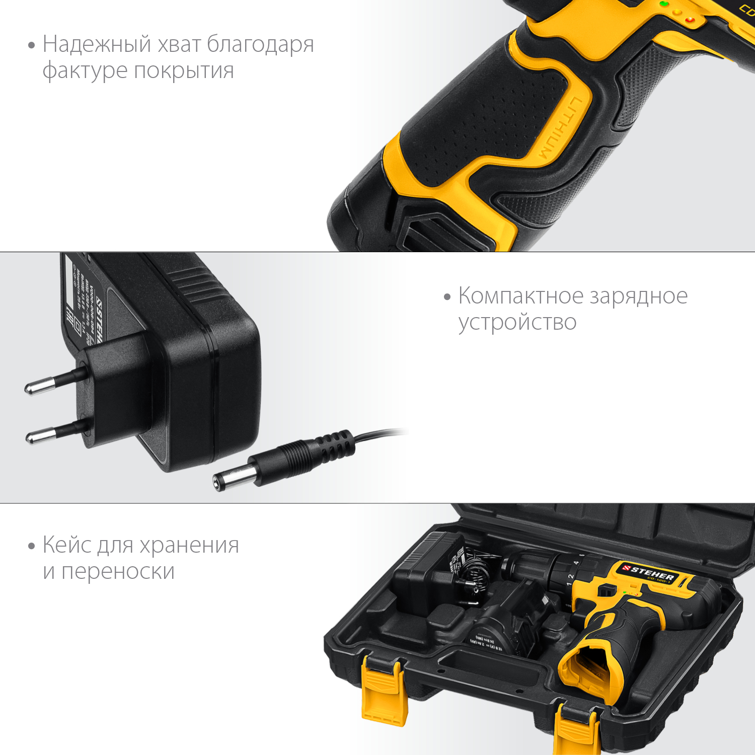 Новый недорогой шуруповерт Steher - помощник в сверлении и заворачивании. Индивидуальный дизайн, удобная эргономика, высокие скорость и крутящий момент обеспечивают комфортную и производительную работу. ″Мягкая″ муфта с минимальным крутящим моментом 0.2 Нм позволяет работать с компьютерными винтиками или мебельной отделкой