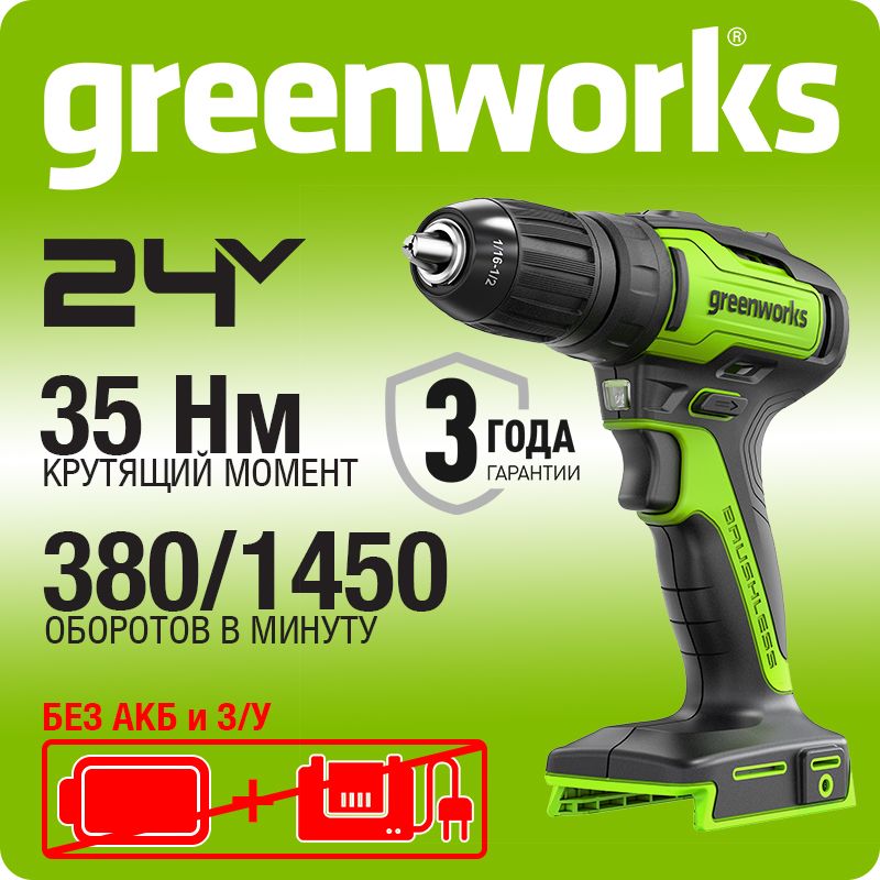 Дрель-шуруповерт аккумуляторная Greenworks GD24DD35, 24V, бесщеточная, без АКБ и ЗУ