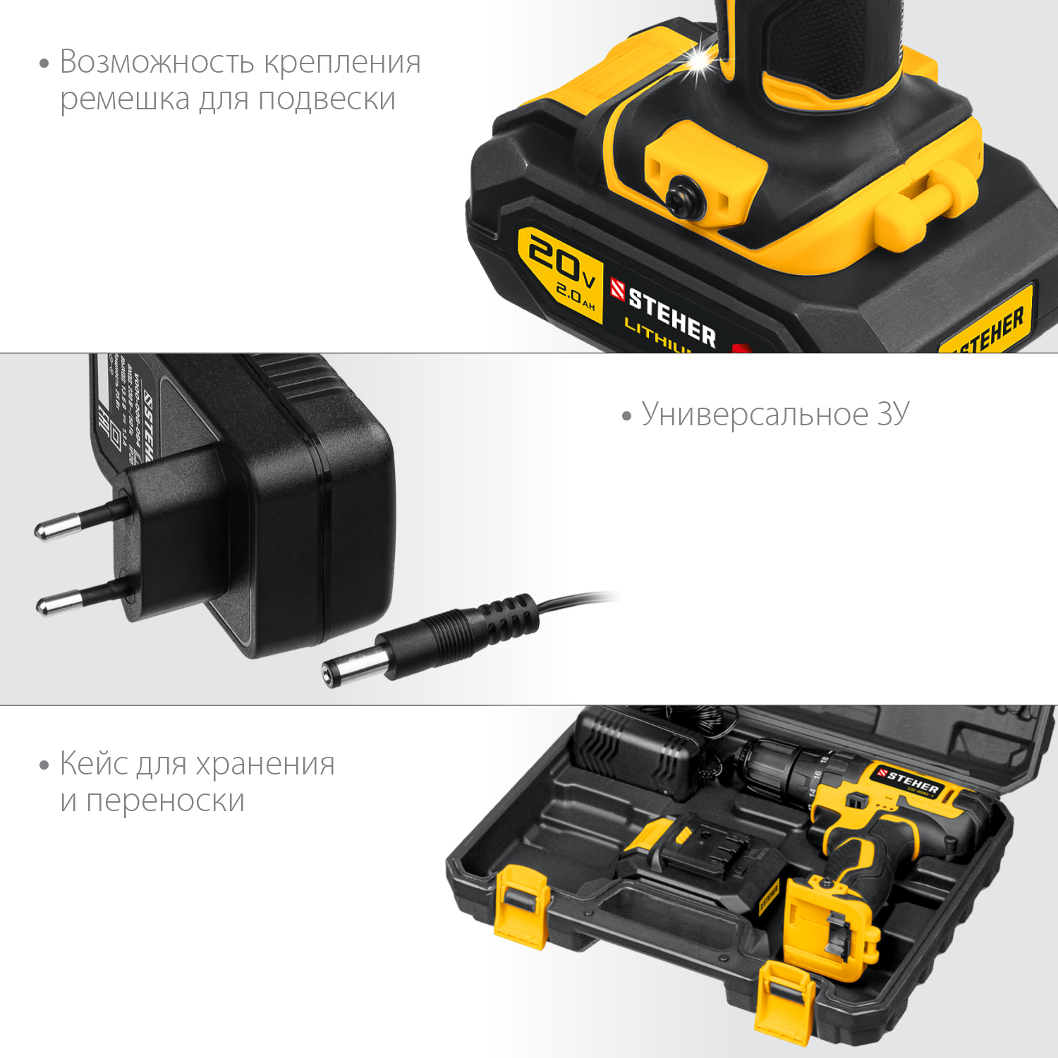 Новый недорогой шуруповерт Steher - помощник в сверлении и заворачивании. Индивидуальный дизайн, удобная эргономика, высокие скорость и крутящий момент обеспечивают комфортную и производительную работу. ″Мягкая″ муфта с минимальным крутящим моментом 0.2 Нм позволяет работать с компьютерными винтиками или мебельной отделкой