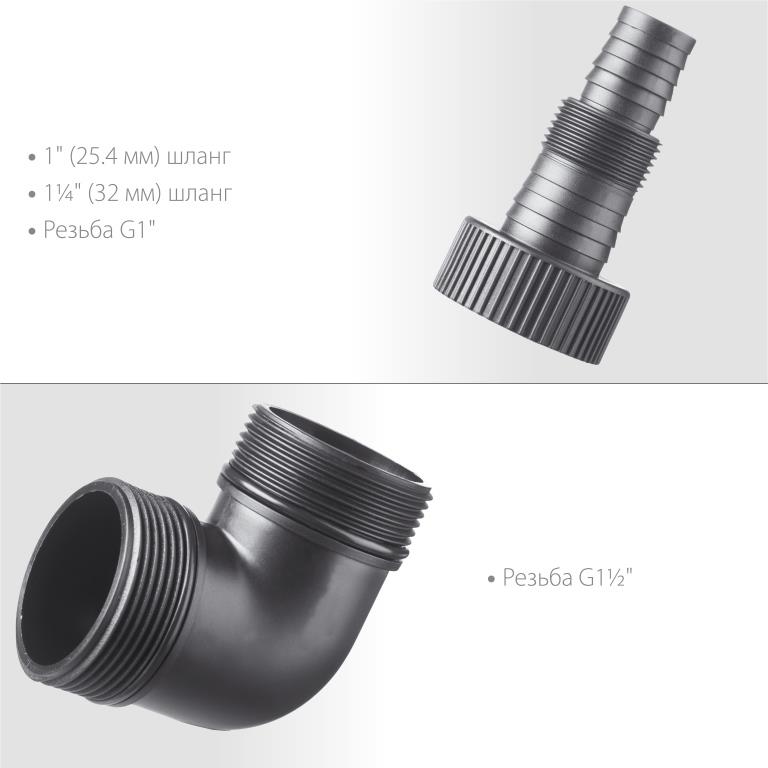 - Универсальный соединительный штуцер от 1'' до 1 3/8'' для шлангов и от G1″ до G1 1/2″ для трубопроводов