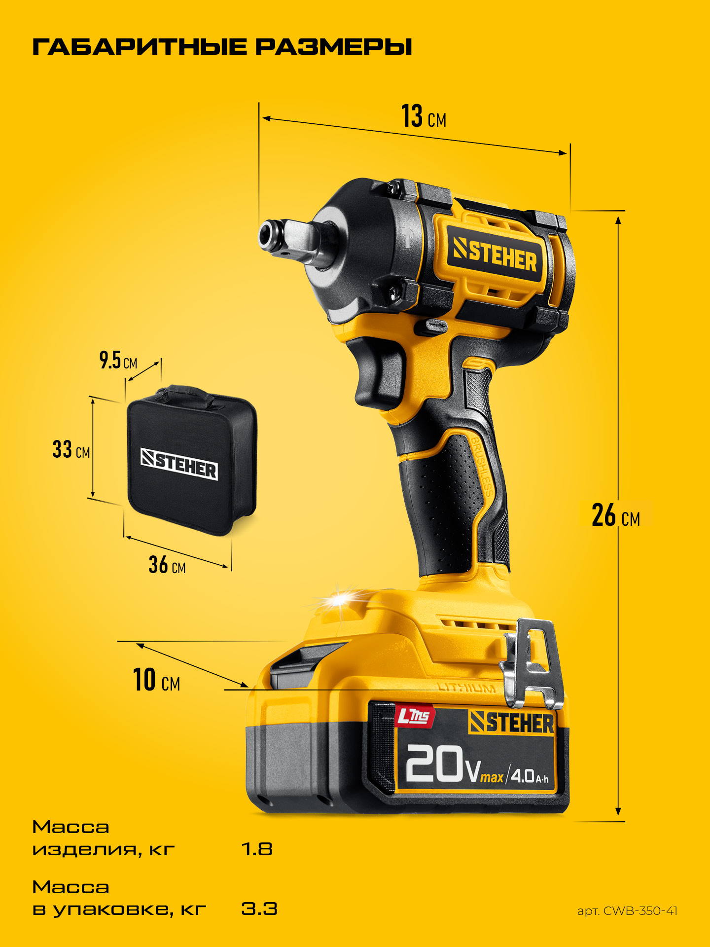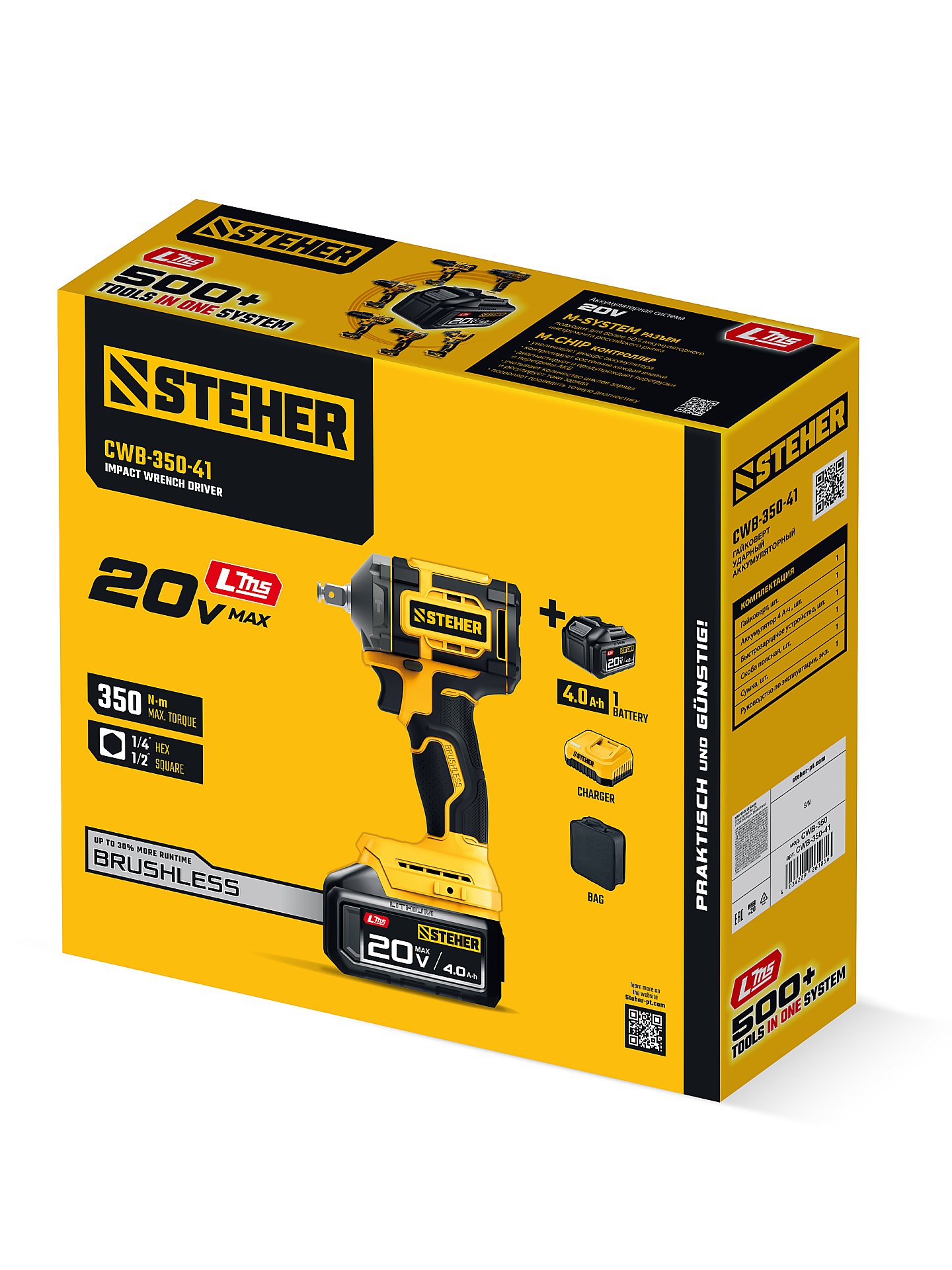 Бесщеточный ударный гайковерт Steher с BRUSHLESS двигателем и максимальным крутящим моментом 350 Н∙м предназначен для фиксации резьбовых соединений размером до М18. Ударная функция с эффективным направлением удара обеспечивает легкое заворачивание без лишней нагрузки на кисть оператора. Имеет современную аккумуляторную систему LMS с 1 АКБ в комлекте, совместимую с одним известным брендом.