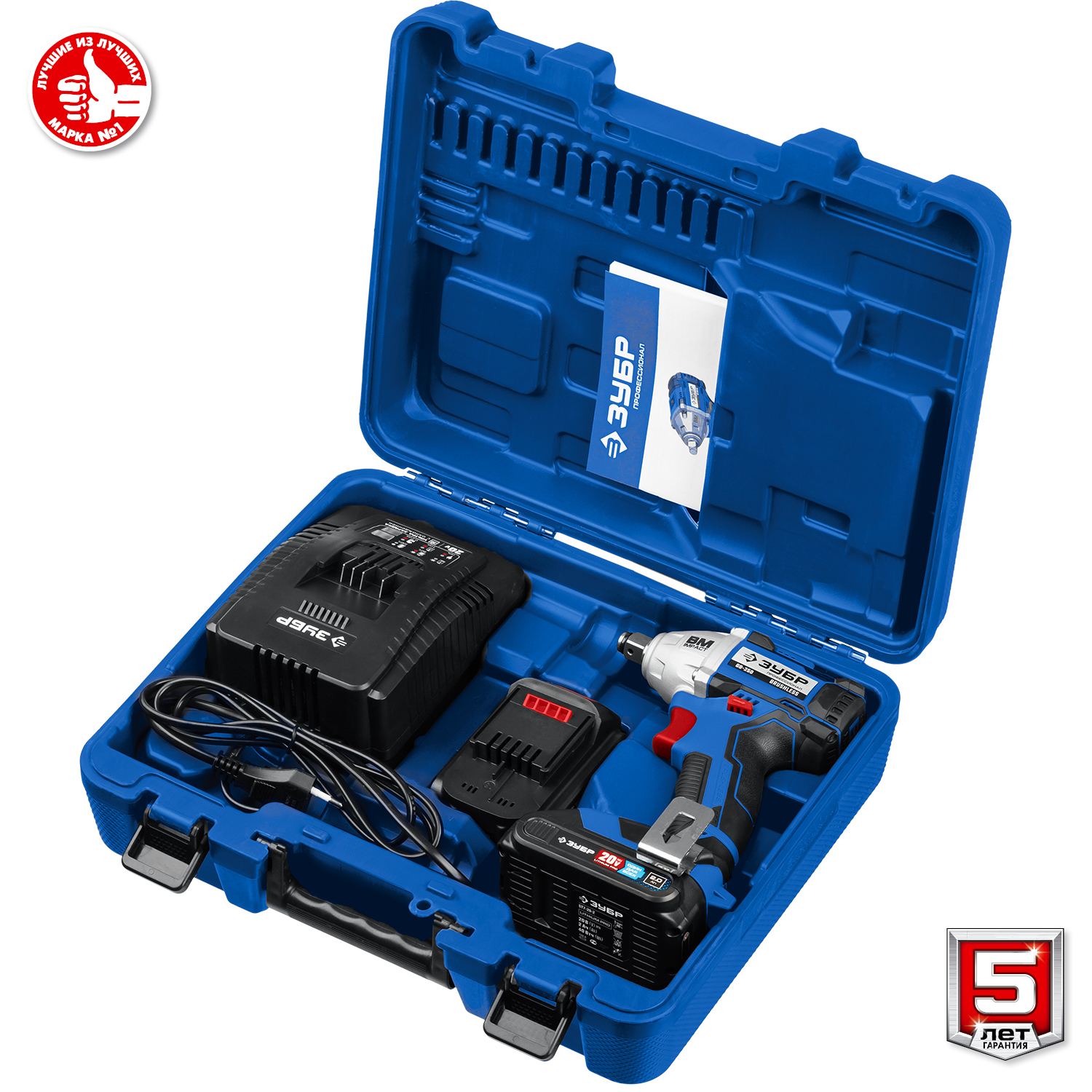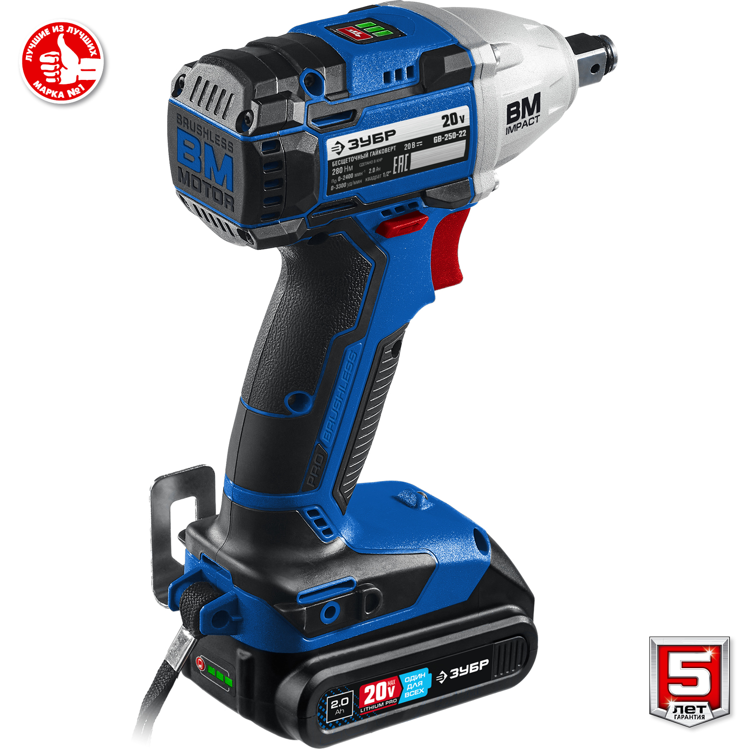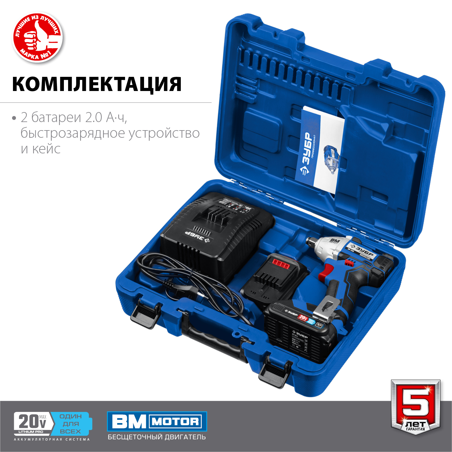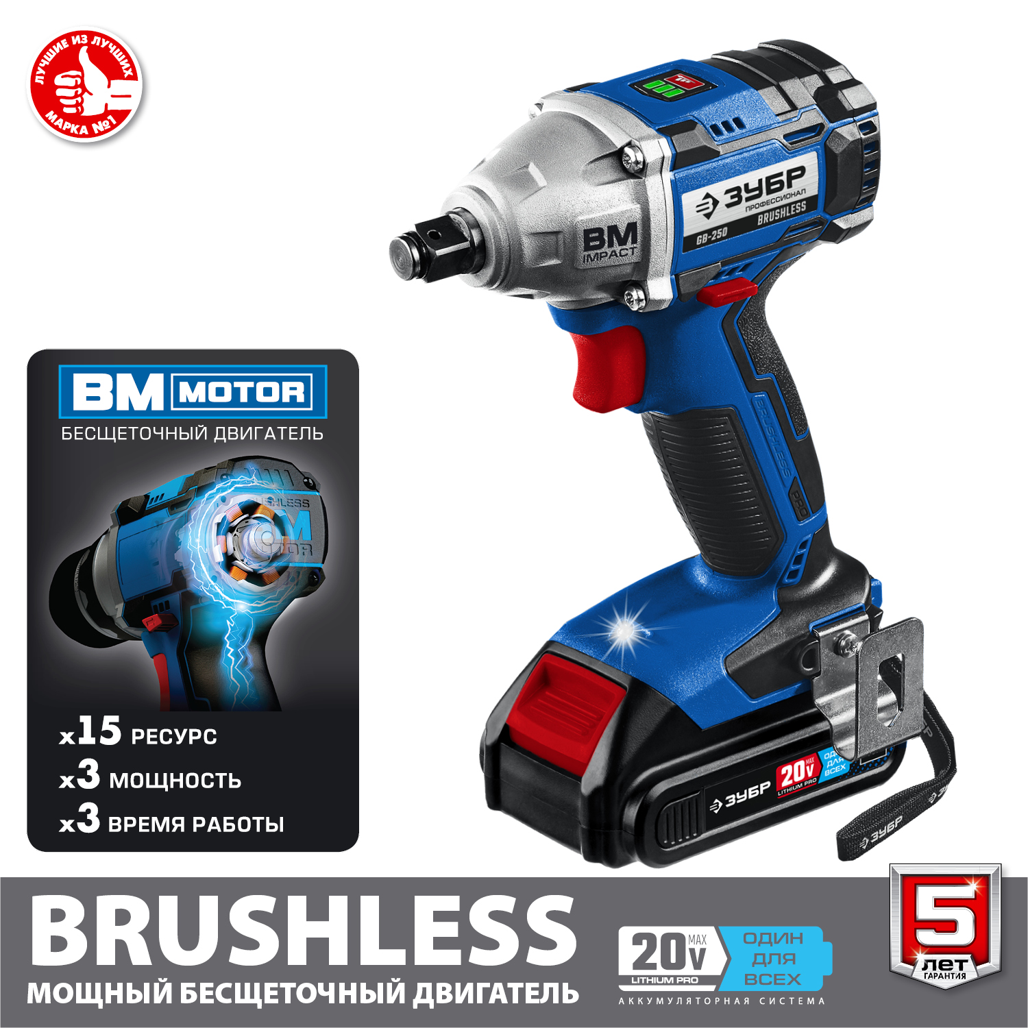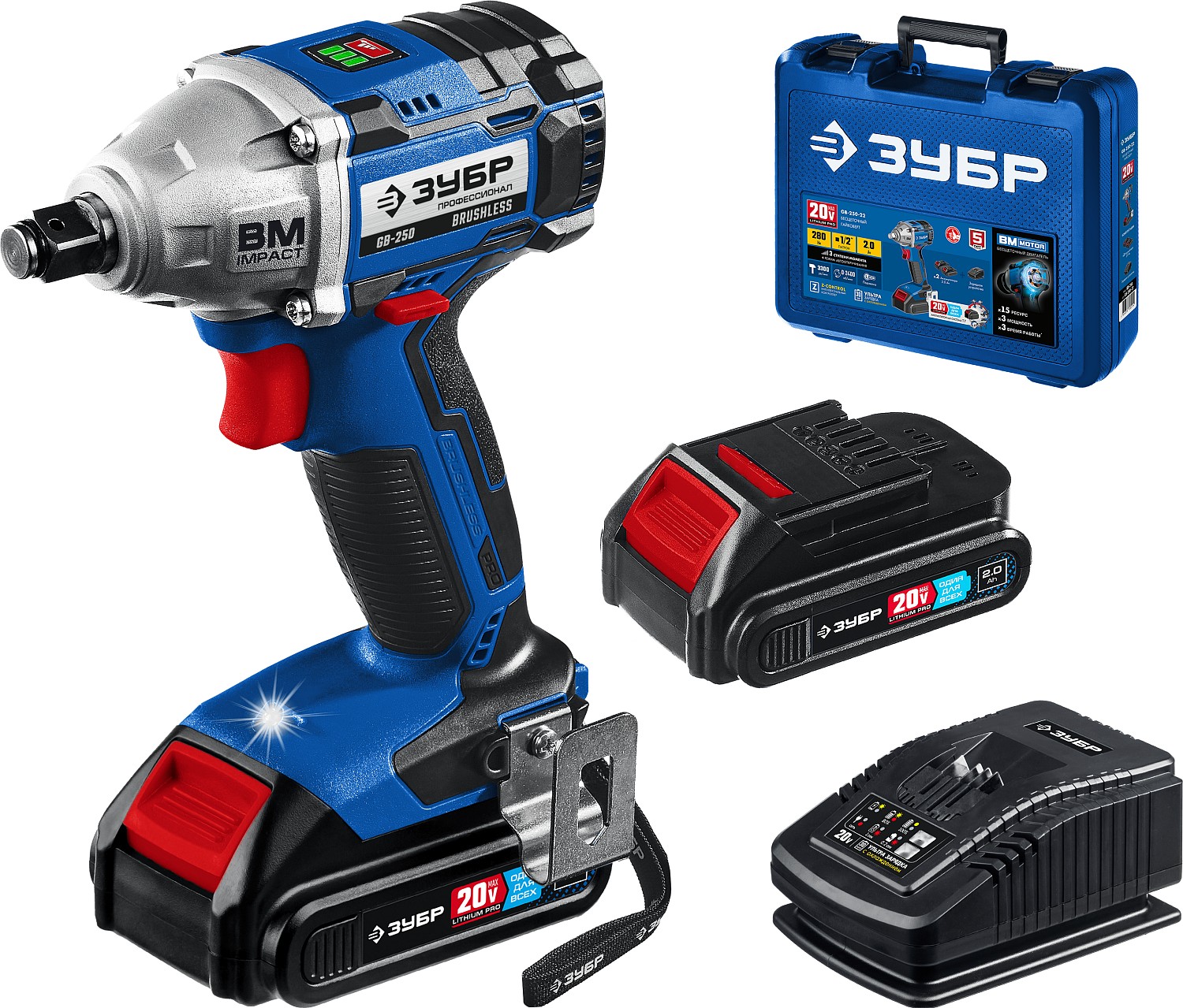 Гайковерт аккумуляторный ЗУБР 20В бесщеточный 2 АКБ (2Ач), в кейсе, Профессионал. GB-250-22