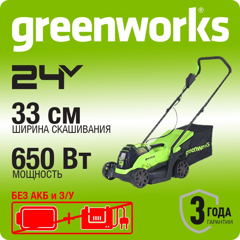 Газонокосилка аккумуляторная Greenworks GD24LM33; Заглушка для мульчирования; Травосборник; Руководство по эксплуатации; Гарантийный талон. |