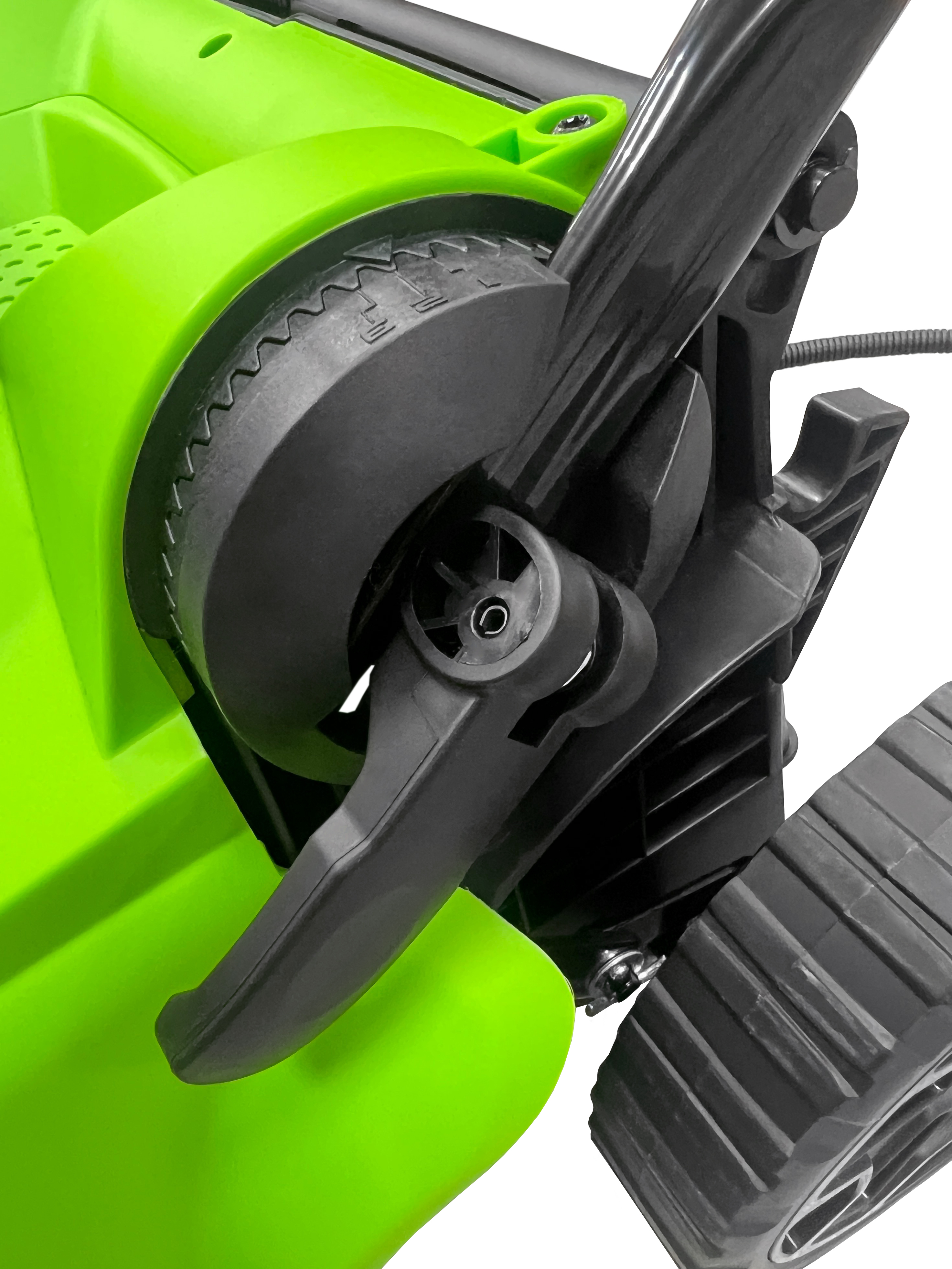 Высота покоса имеет пять ступеней регулировки высоты в диапазоне от 30 до 85 мм. Регулировка высоты центральная и осуществляется одной ручкой, расположенной у переднего колеса. Также у косилки есть режим мульчирования.