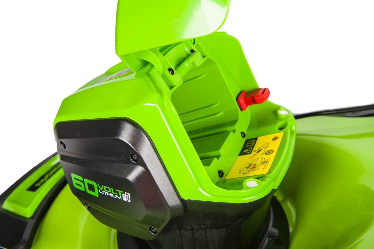 Устройство сочетает 3 функции: мульчирование - измельчение состриженной травы и выброса ее на газон, сбор состриженной травы в специальный мешок объемом 60 л и стрижка травы с боковым выбросом в сторону. Рабочая ширина косилки 46 см. Для регулировки уровня скашивания на корпусе расположен специальный рычаг с 7-ю положениями. Высота скашивания регулируется от 20 до 80 мм, привод регулировки производится на все 4 колеса одновременно. Дополнительный предохранитель защищает двигатель от механических повреждение при попадании ножа на твердый предмет. Для долговечной службы дека косилки сделана из стали, а корпус из специального “мягкого” ABS пластика, устойчивого к сколам и трещинам. Аккумуляторная батарея 60 вольт, используемая этой косилкой, совместима с целым спектром устройств линейки Greenworks 60V.