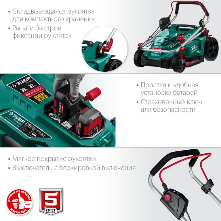 - Мощный двигатель напряжением 36 В ускоряет процесс обработки, а оптимальная ширина кошения снижает нагрузку, что увеличивает ресурс изделия