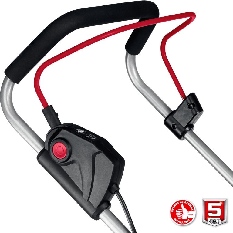 - Облегченные колеса и эргономичная рукоятка облегчают перемещение косилки по газону