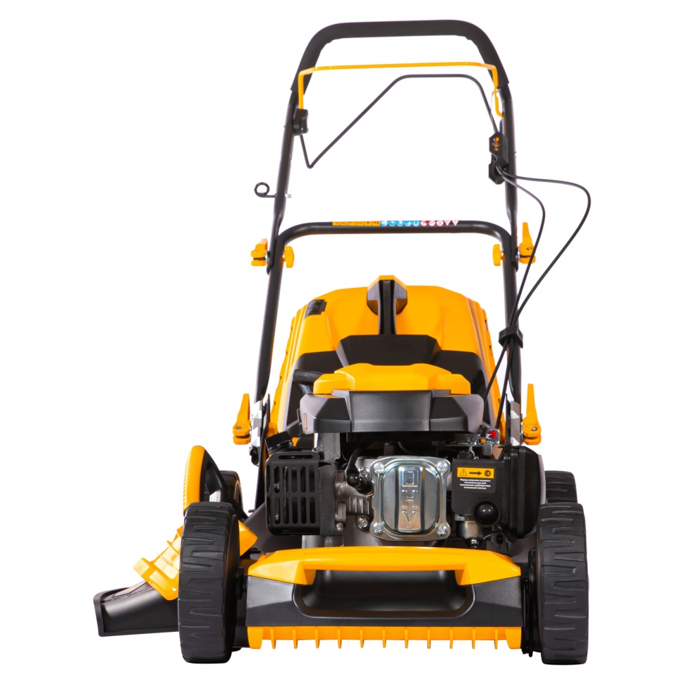 Газонокосилка функционирует в одном из 4-х режимов: сбор скошенной травы в травосборник объемом 60 л, боковой или задний выброс, мульчирование (т.е. тщательное измельчение травы и ее распределение по приусадебному участку).