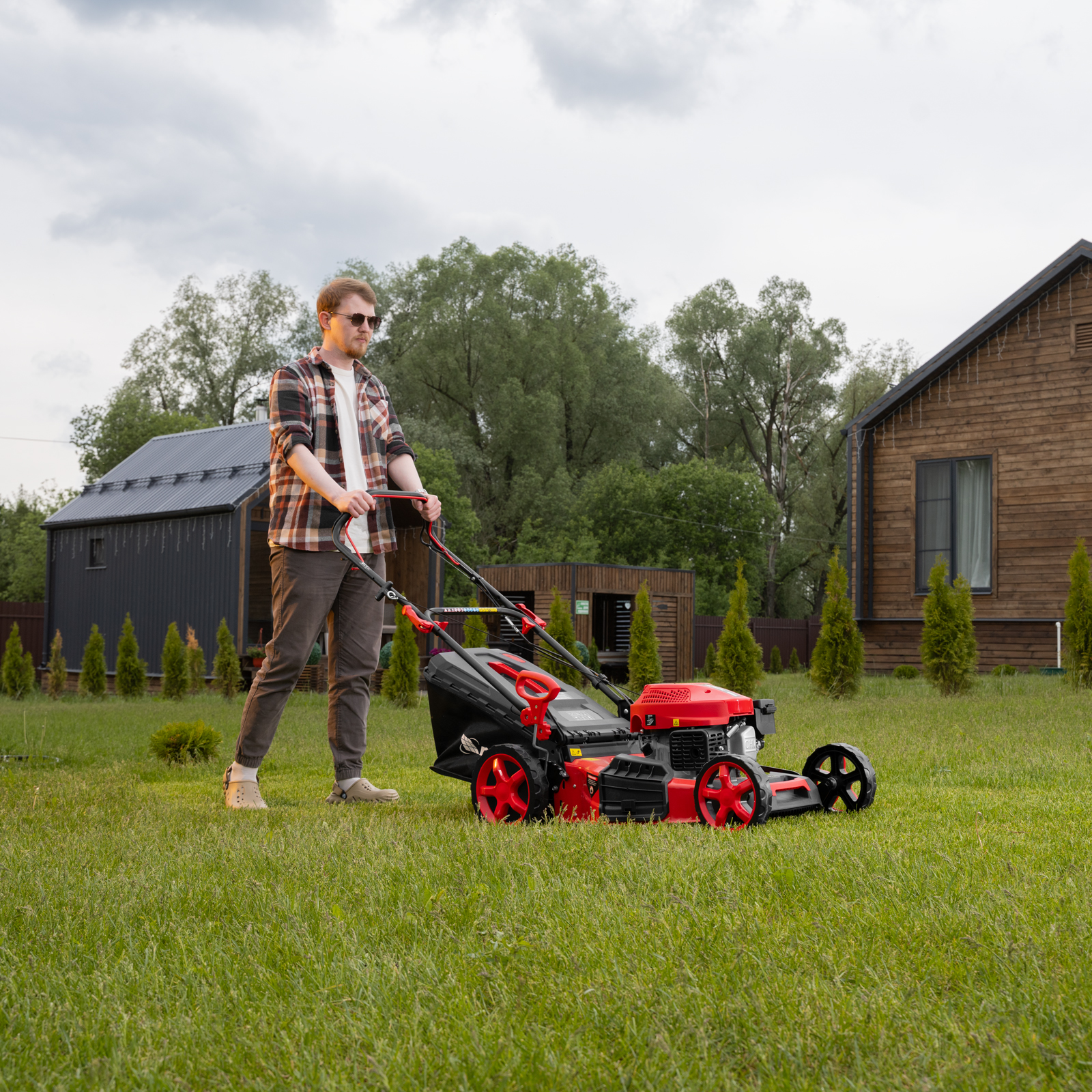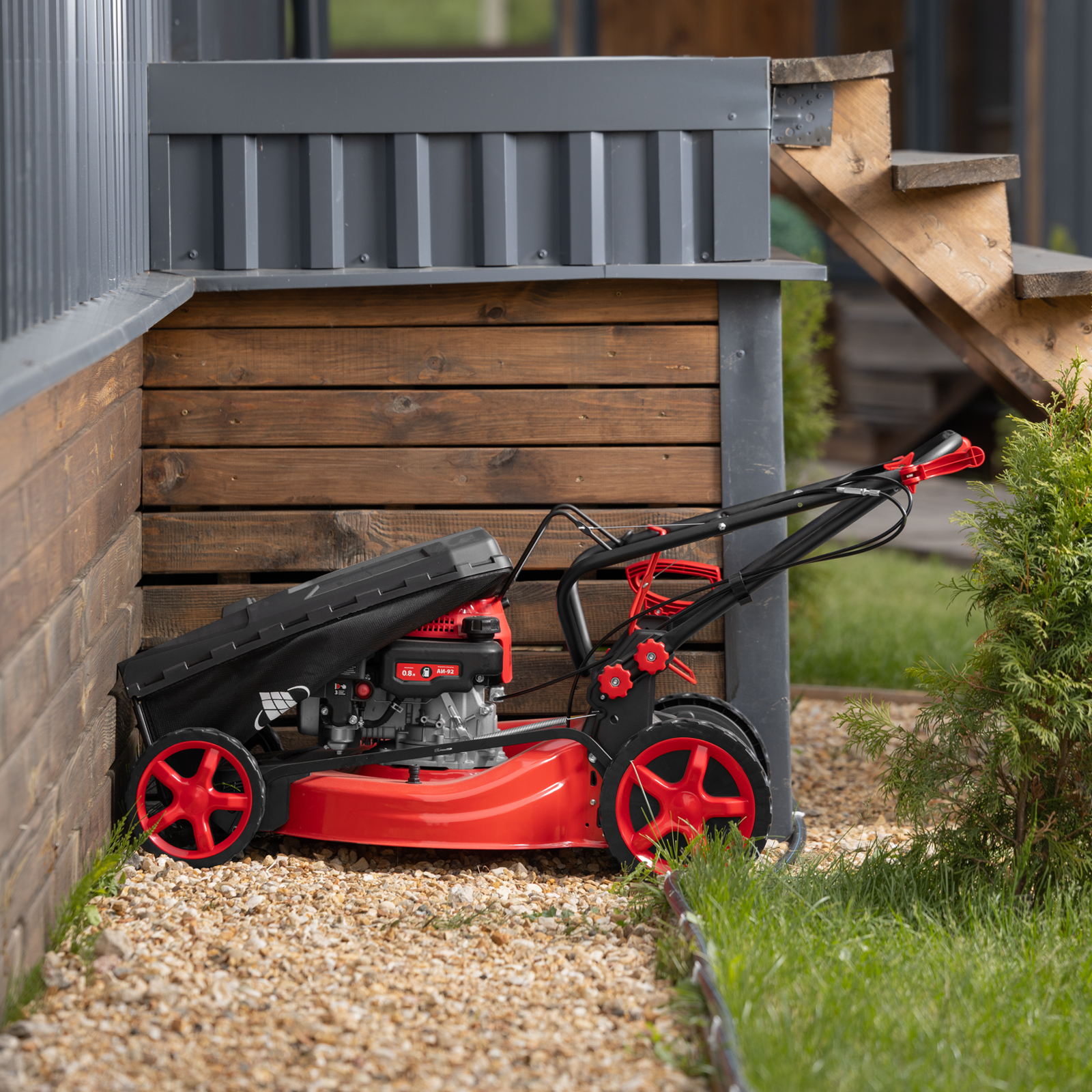 - Привод на колеса — газонокосилку не нужно толкать, что значительно упрощает работу.