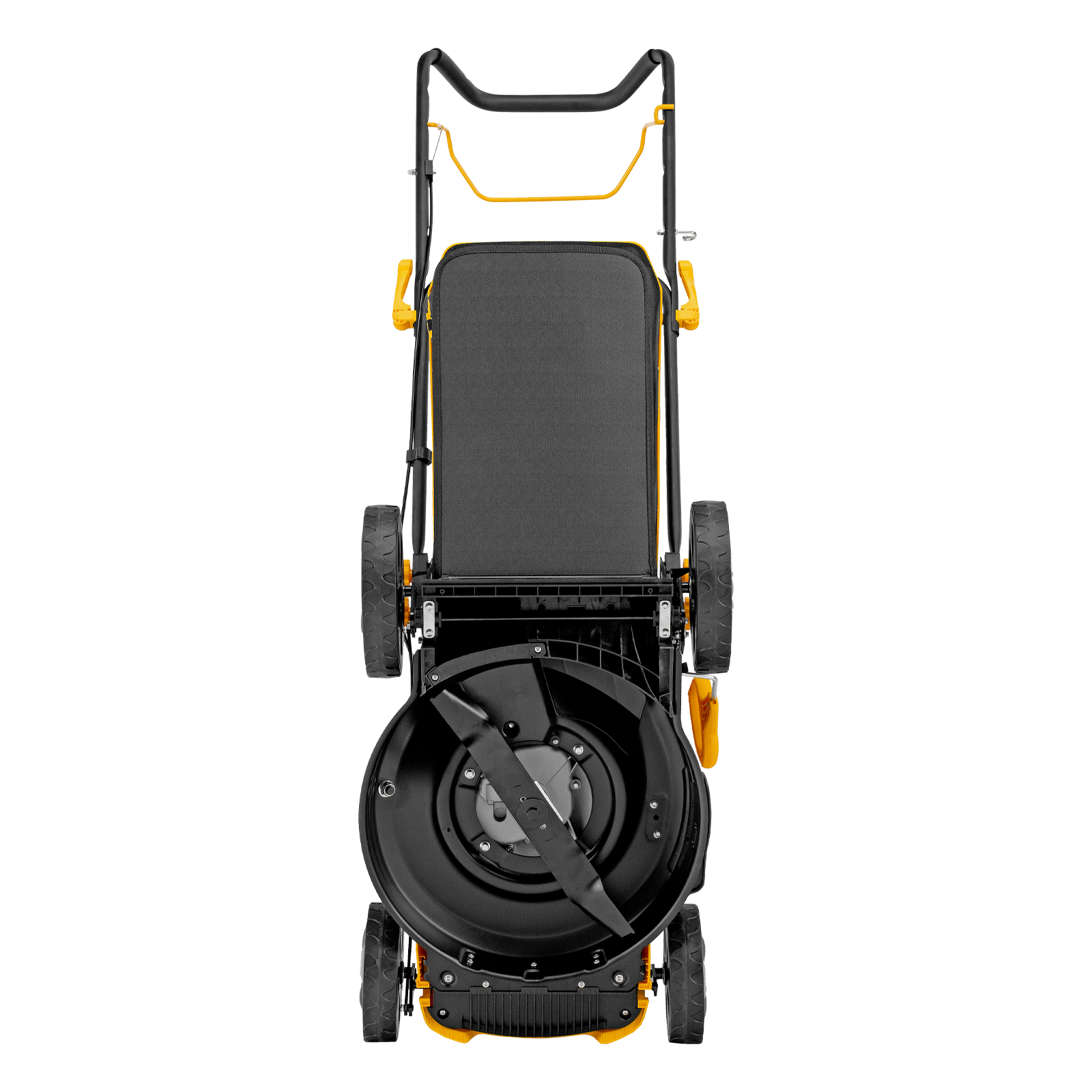 - Продуманная конструкция — рукоятка с эксцентриковыми фиксаторами легко складывается, газонокосилка не занимает много места в зоне хранения.