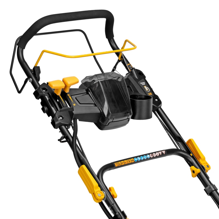Ключевая особенность газонокосилки - наличие электростартера, значительно упрощающего запуск двигателя, и вариатора, позволяющего регулировать скорость движения. Машина самоходная, поэтому с ней справится даже неопытный пользователь - достаточно только направлять ее.
