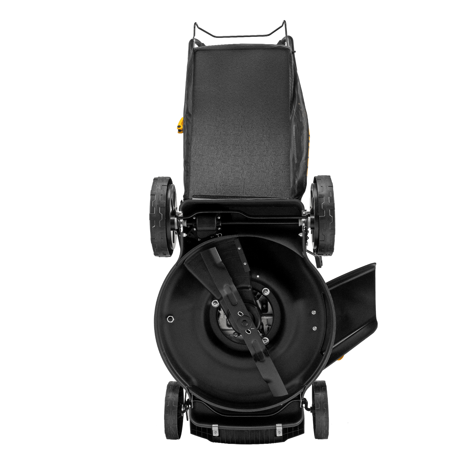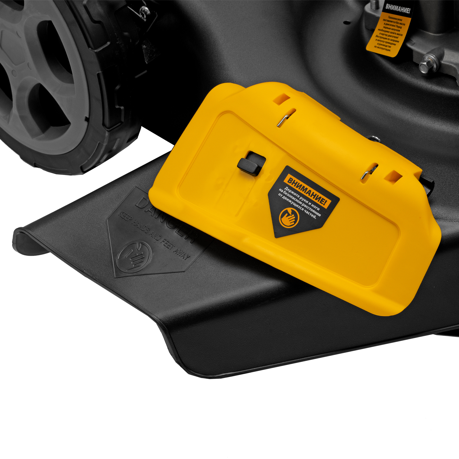 - Широкие колеса Eco-friendly — позволяют газонокосилке легко проходить по газону, не повреждая его.