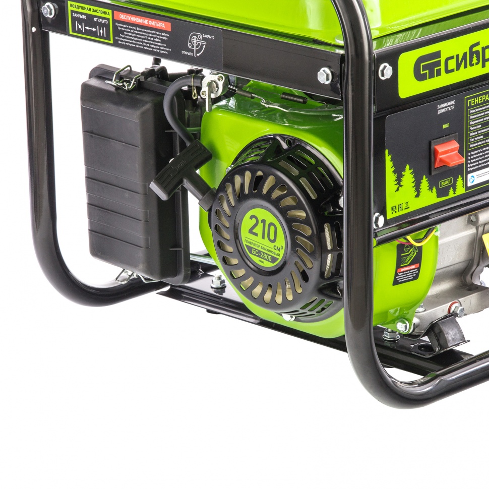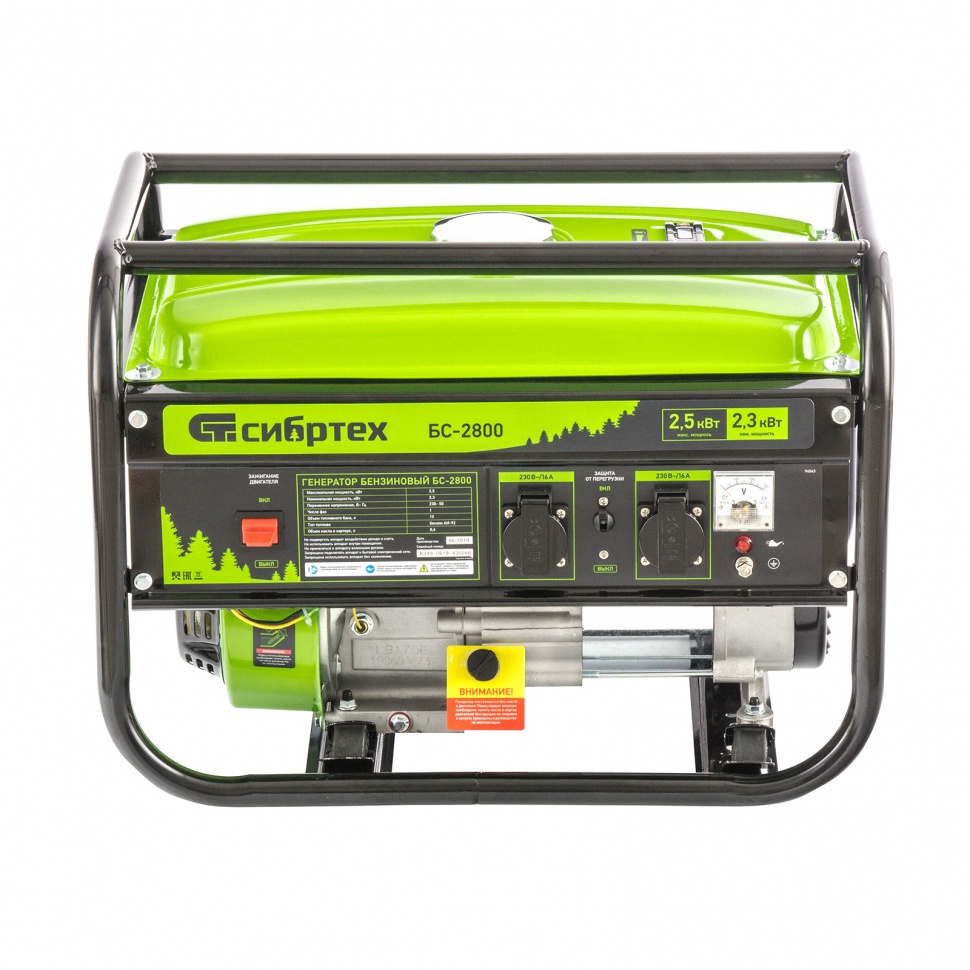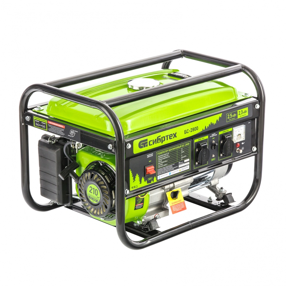 Бензиновый генератор Сибртех БС-2800 94543 на 230 В, максимальной мощностью 2,5 кВт, с 4-тактным двигателем и баком объемом 15 л, подходит для использования на даче, в гараже, мастерской или на стройке. Небольшой вес 37,6 кг позволяет брать генератор с собой на выездные работы или на природу. Мощности 2,5 кВт достаточно для одновременного питания 2 ламп накаливания, холодильника, СВЧ-печи и телевизора. 2 розетки упрощают одновременное подключение нескольких приборов.