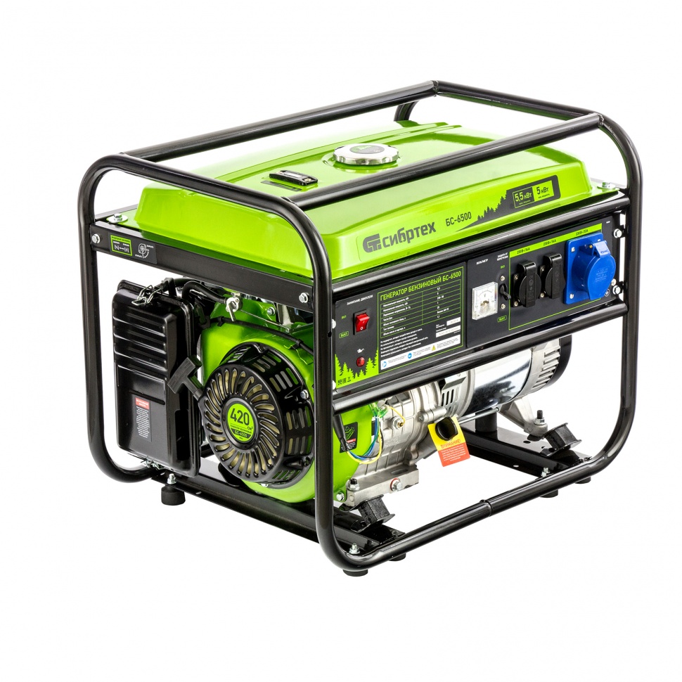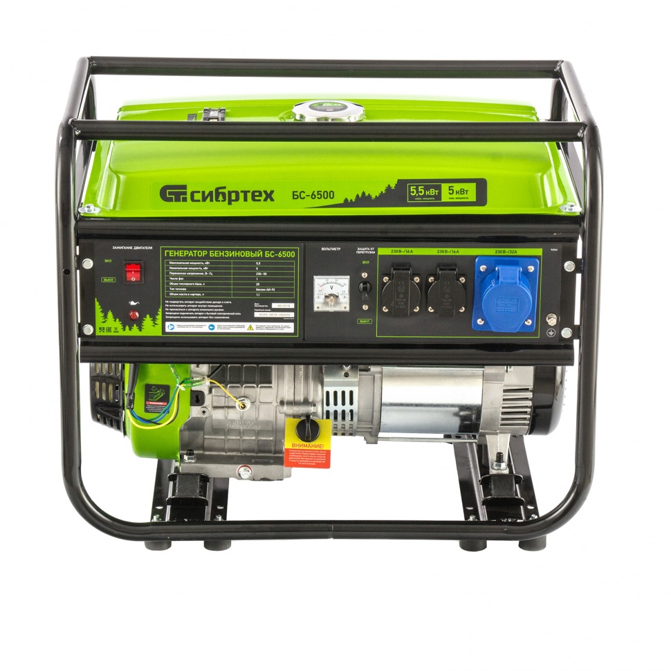 Бензиновый генератор Сибртех БС-6500 94546 на 230 В, с 4-тактным двигателем, баком на 25 л и ручным стартером, выдает 5,5 кВт и подходит для создания целой электросети в загородном доме, магазине, мастерской или на строительной площадке. К нему можно одновременно подключить 5 ламп накаливания, холодильник, телевизор. Для подключения приборов предусмотрено 3 розетки. Одна из них силовая на 32А, что позволяет запитать мощное оборудование, например, электрическую плиту.