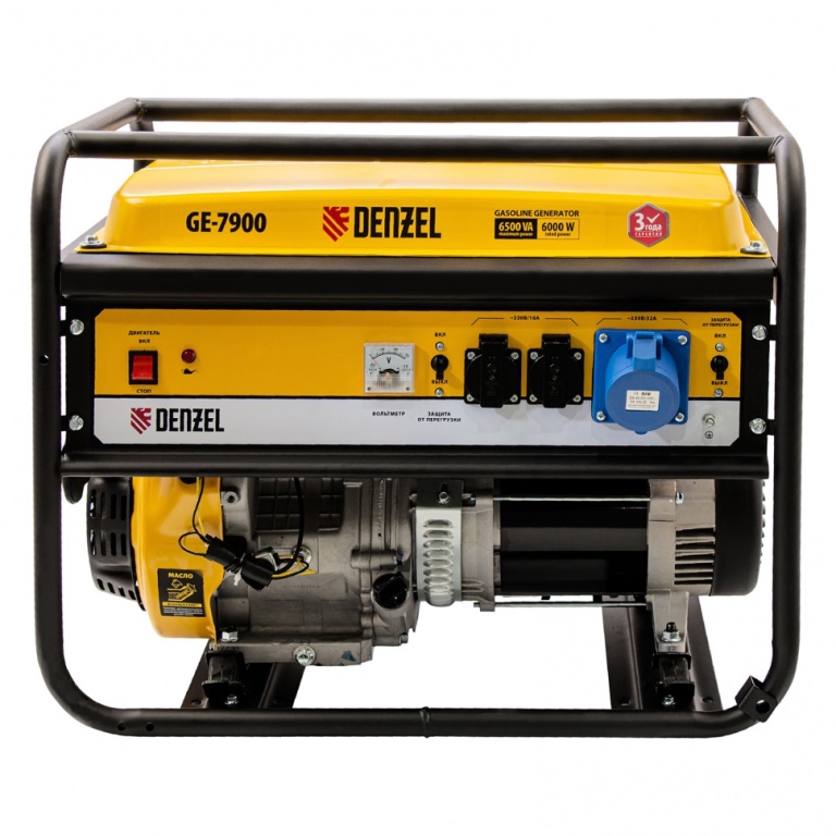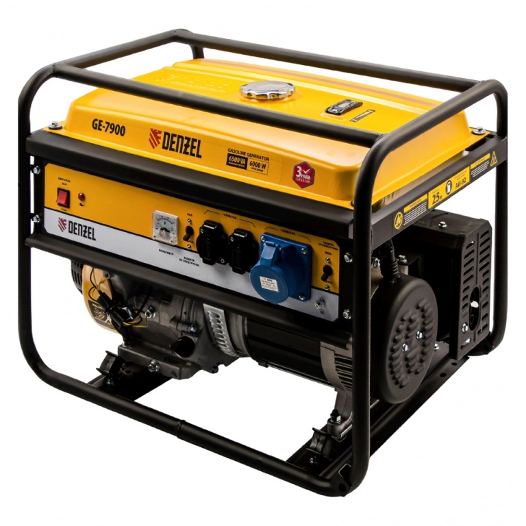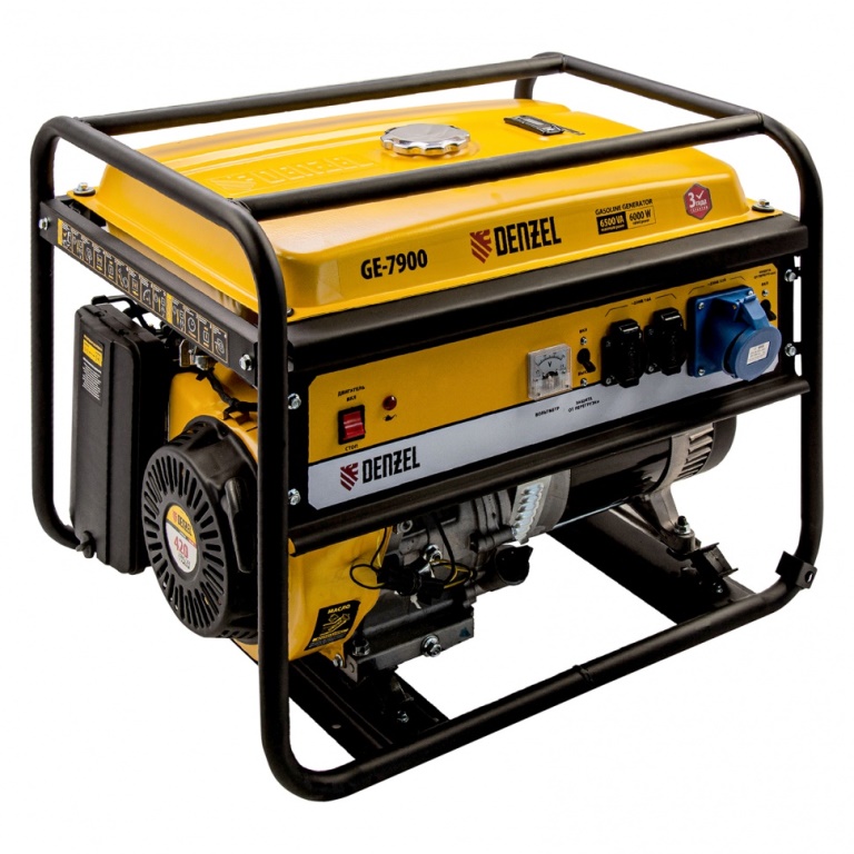 Генератор Denzel GE 7900 94638, 220 В / 50 Гц, мощностью 6,5 кВт, с ручным стартом и объемом бака 25 л, выдерживает большие нагрузки и подходит для питания мощного оборудования на даче, строительной площадке, в торговой точке. Генератор оснащен 3 розетками, одна из которых силовая, что позволяет подключать промышленное оборудование. Полного бака хватает на 8,5 ч работы без дозаправки.