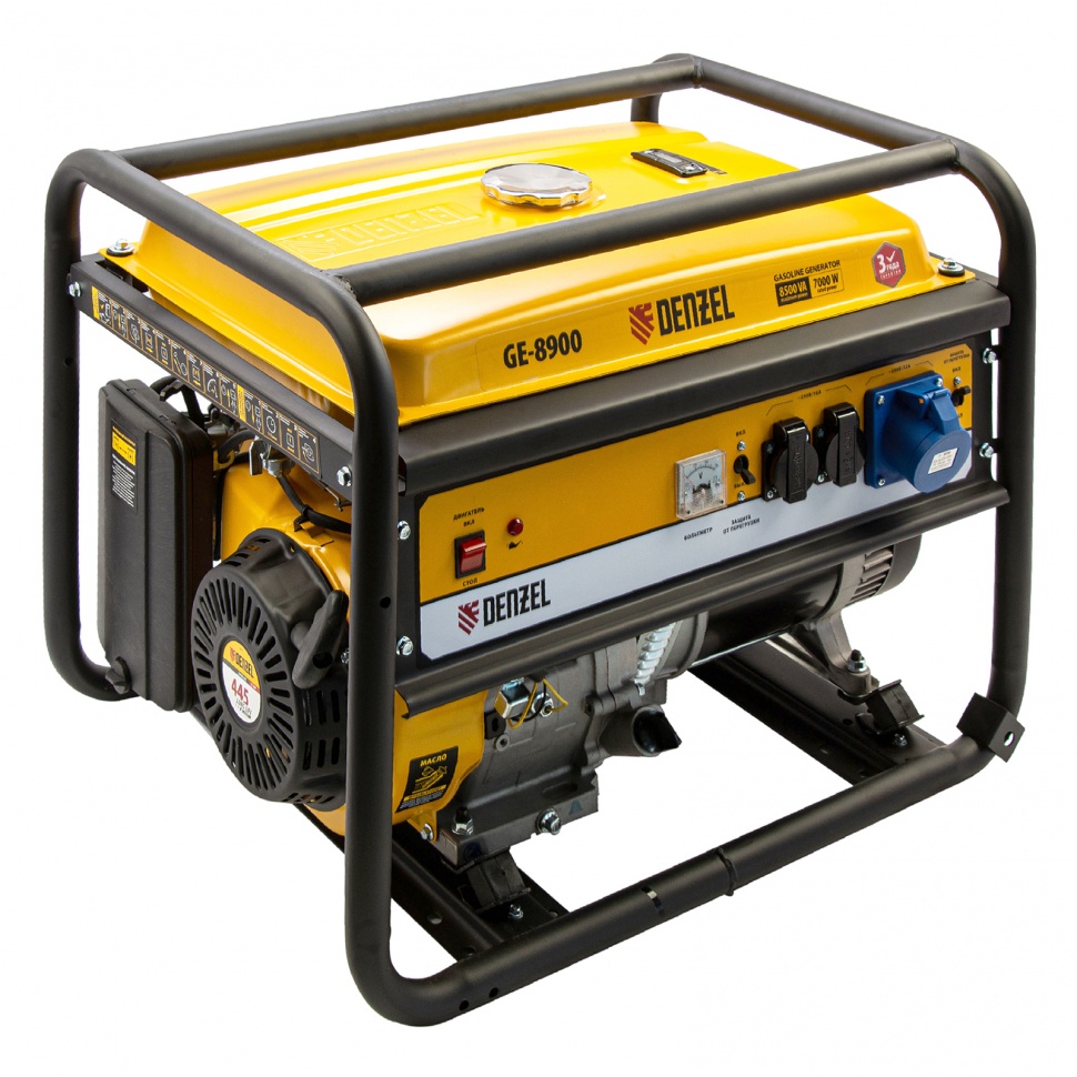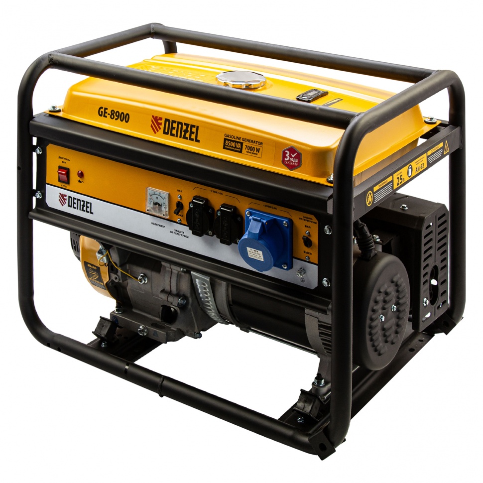 Бензиновый генератор Denzel GE 8900 , 220 В / 50 Гц, с баком на 25 л и ручным стартом, вырабатывает 8,5 кВт и способен обеспечить электричеством большой загородный дом, магазин или строительную площадку. Можно запитать сразу несколько потребителей, например, обогреватель или кондиционер, насос и электроинструменты. Силовая розетка позволяет подключать оборудование высокой мощности. Полного бака хватает на 7,8 ч работы без дозаправки.