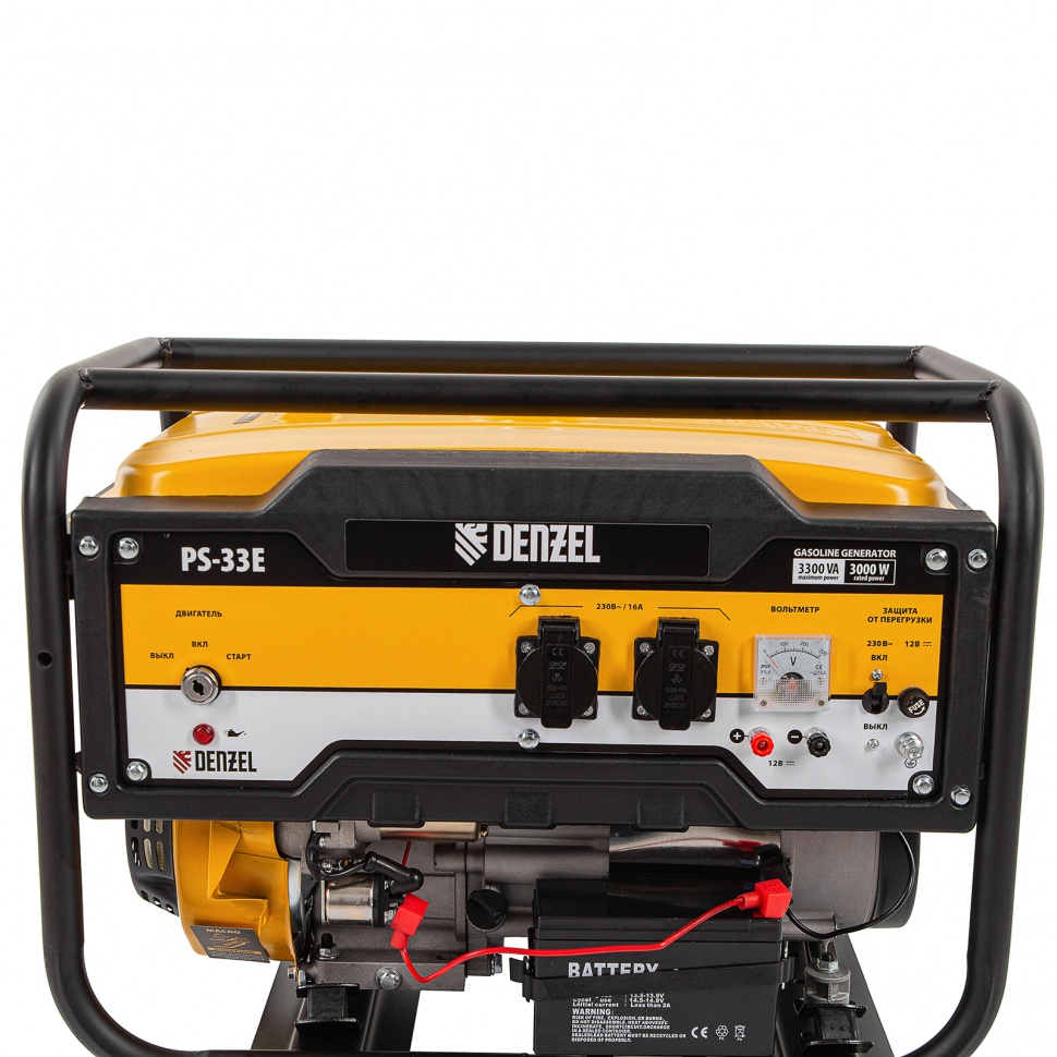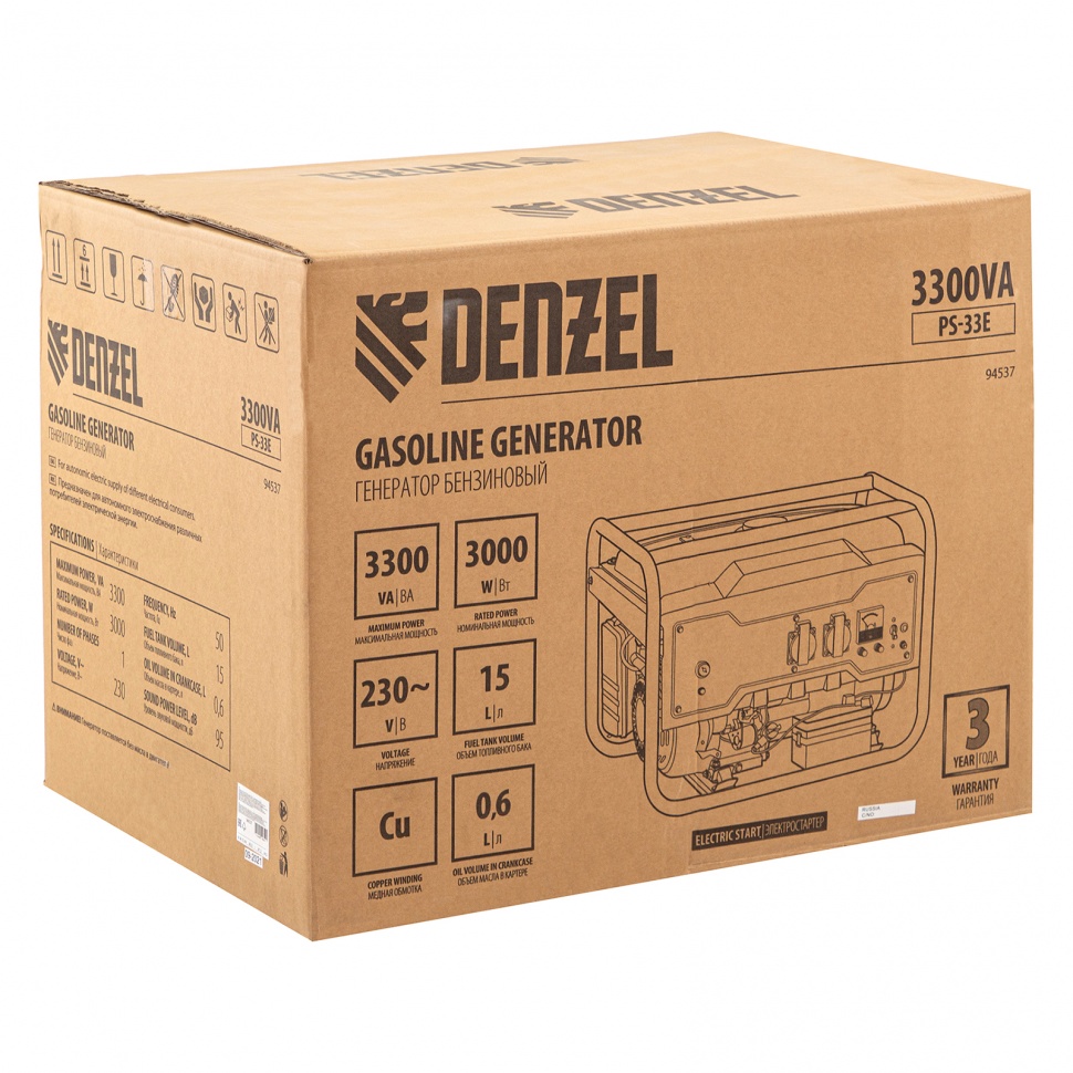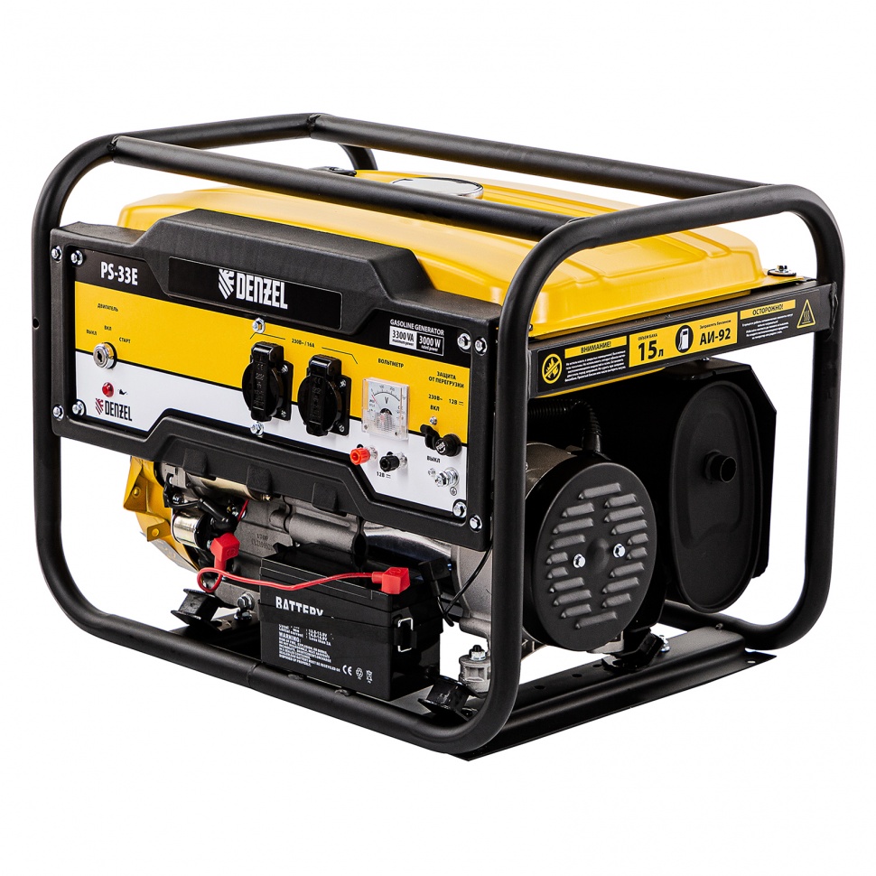 Генератор бензиновый Denzel PS-33E 94537 с электростартером, мощностью 3,3 кВт, напряжением 230 В, с топливным баком объемом 15 л, предназначен для автономного обеспечения бытовой техники и инструментов электрической энергией. Отлично подойдет для использования в загородном доме или для выездных мероприятий в качестве резервного источника питания. Мощный и экономичный двигатель позволяет подключать электроприборы суммарной мощностью до 3,3 кВт, потребляя всего 1,15 литров топлива АИ-92 за 1 час работы.