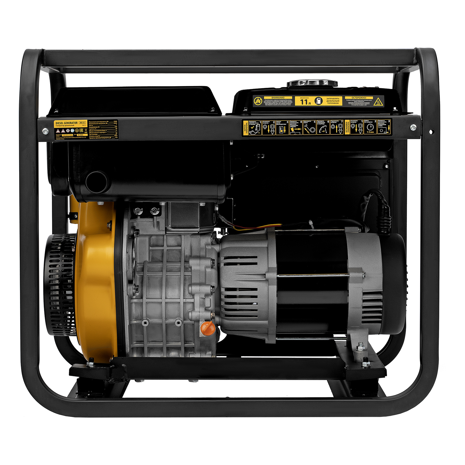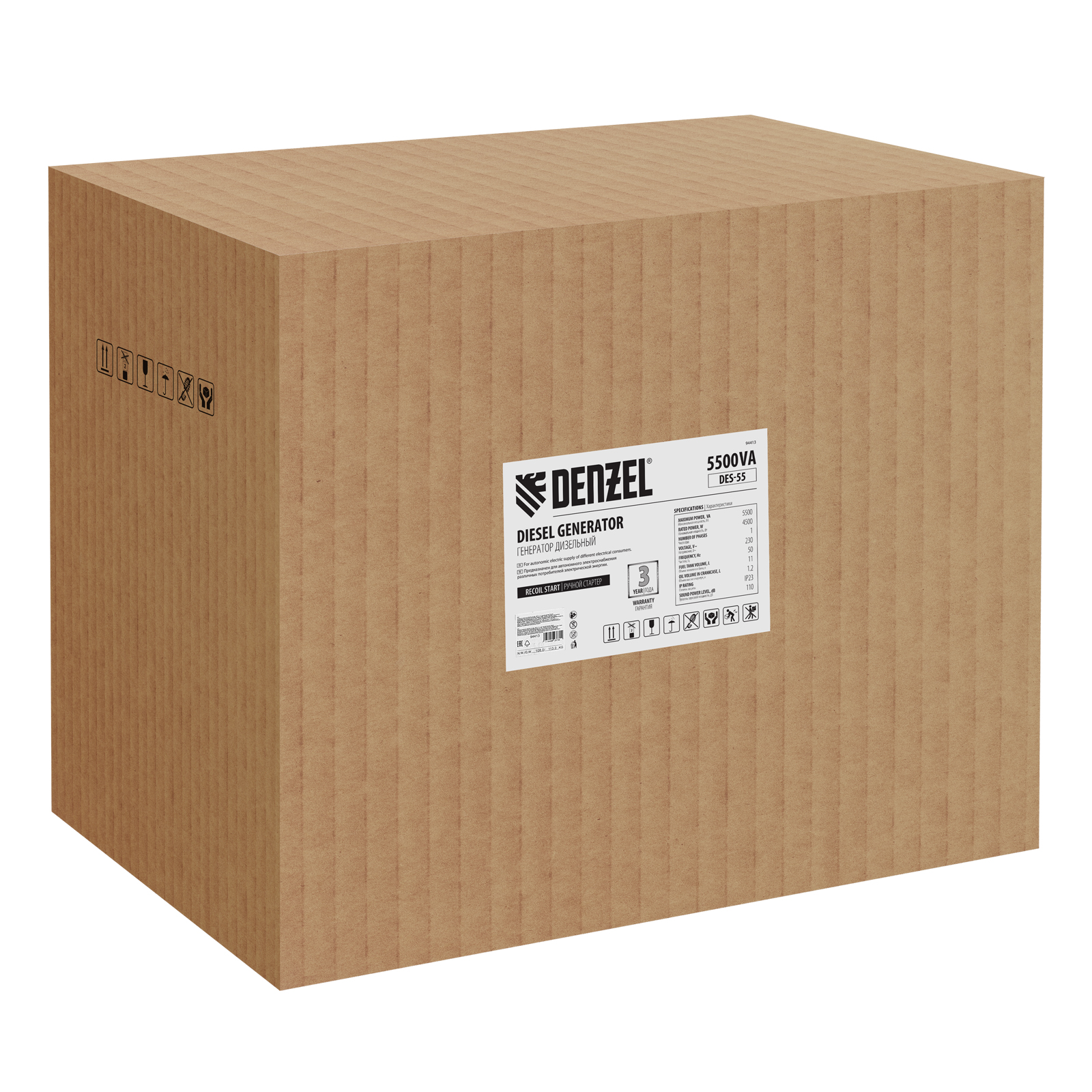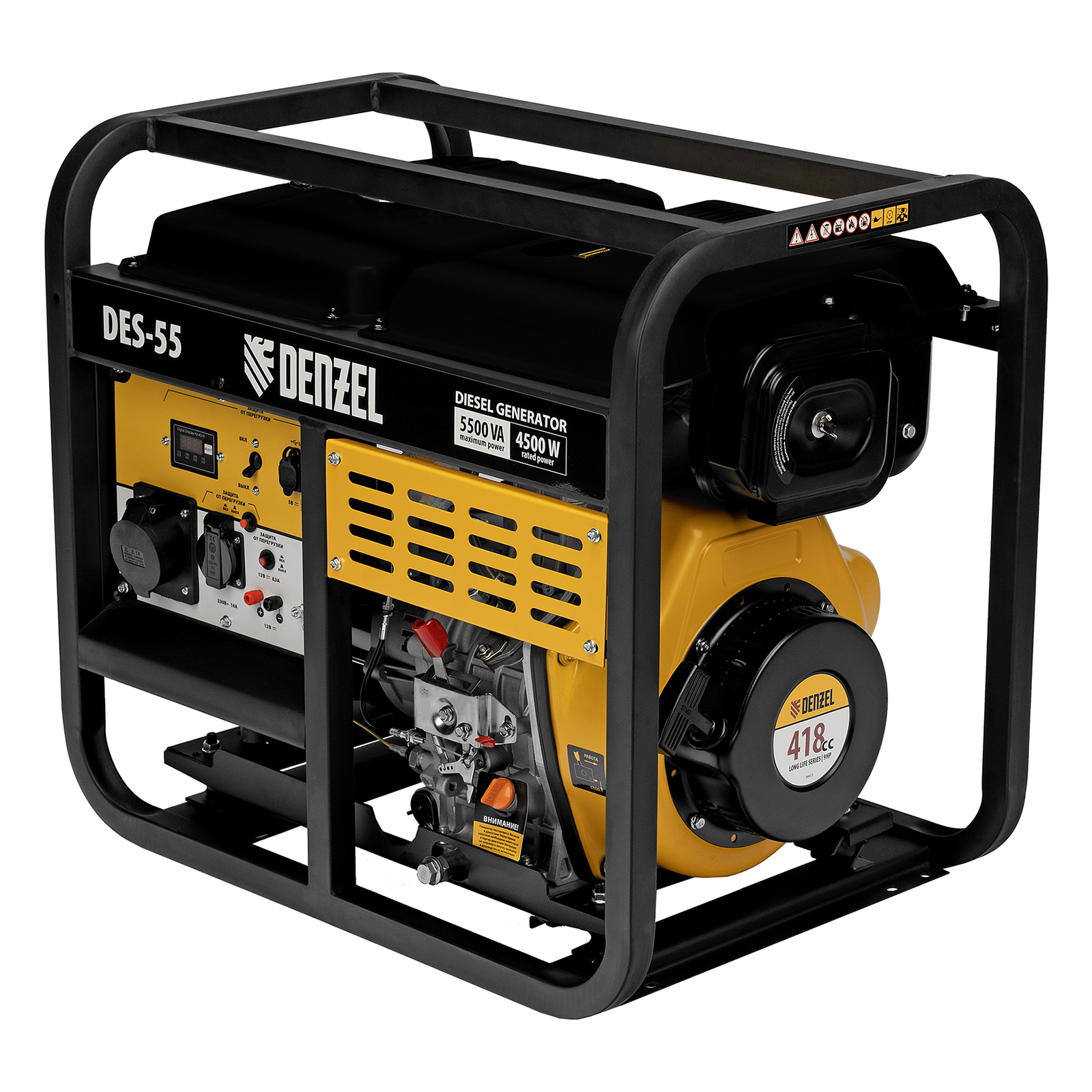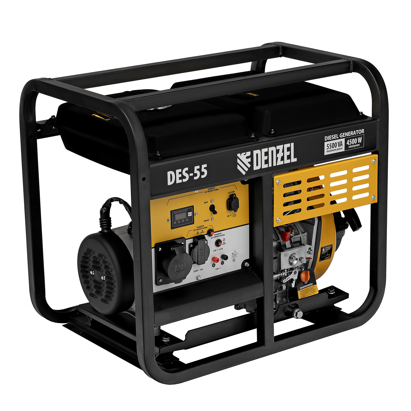 Генератор дизельный Denzel DES-55 с объемом топливного бака 11 л, с ручным стартером, имеет максимальную выходную мощность 5,5 кВт и поддерживает напряжение в сети 230 В. Используется для снабжения энергией потребителей однофазного тока (осветительных приборов, бытовой техники, электроинструмента) при отсутствии доступа к стационарному источнику питания. Для подключения электроприборов служат 2 розетки: 230 В/16 А и 230 В/32 А. Клеммы постоянного тока 12 В позволяют заряжать автомобильные аккумуляторы, а двойной выход USB 5 В предназначен для подключения мобильных устройств (планшетов, смартфонов и т. д.). Генератор пригодится на строительной площадке и в загородном доме.