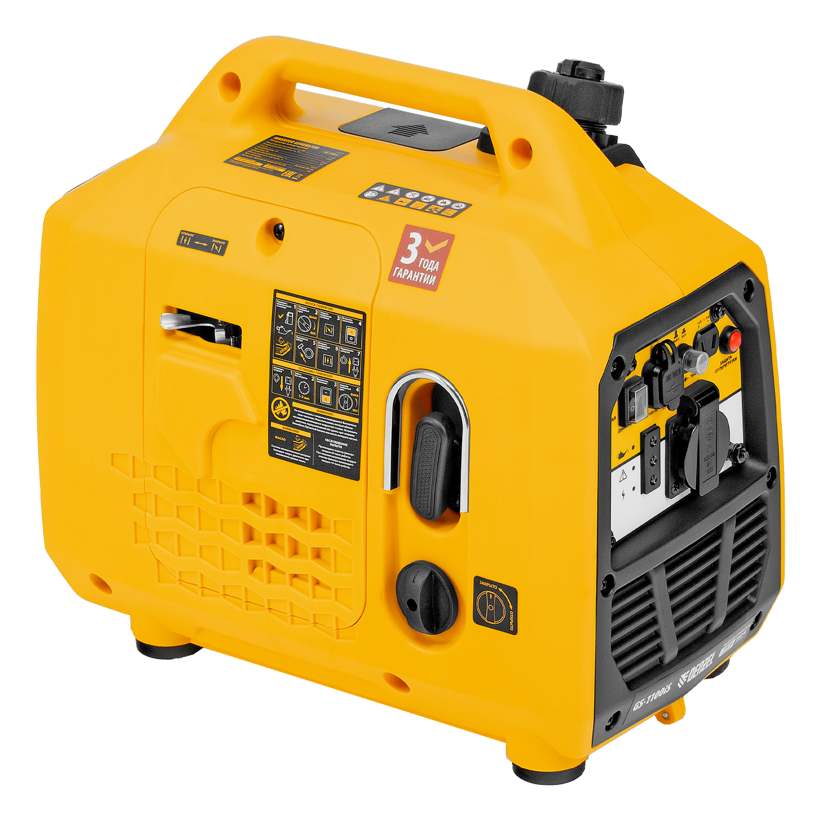 Генератор инверторный Denzel GS-1100iS 94718 максимальной мощностью 1,1 кВт, в закрытом корпусе и с ручным стартом, поддерживает напряжение 230 В. Незаменим при отсутствии электросети: к нему можно подключать осветительные приборы, электроинструмент, бытовую технику. Для этого предусмотрена розетка 230 В/16 A, закрытая специальной крышкой для защиты от пыли и влаги. Генератор обеспечивает высокое качество электрической энергии и подходит для работы с серверами, цифровой техникой и т.д. Выход 12 В позволяет заряжать автомобильные аккумуляторы. Также предусмотрена возможность обеспечения электропитанием мобильной техники: смартфонов, планшетов и т.д. Генератор пригодится в загородном доме, на рыбалке и т.д.