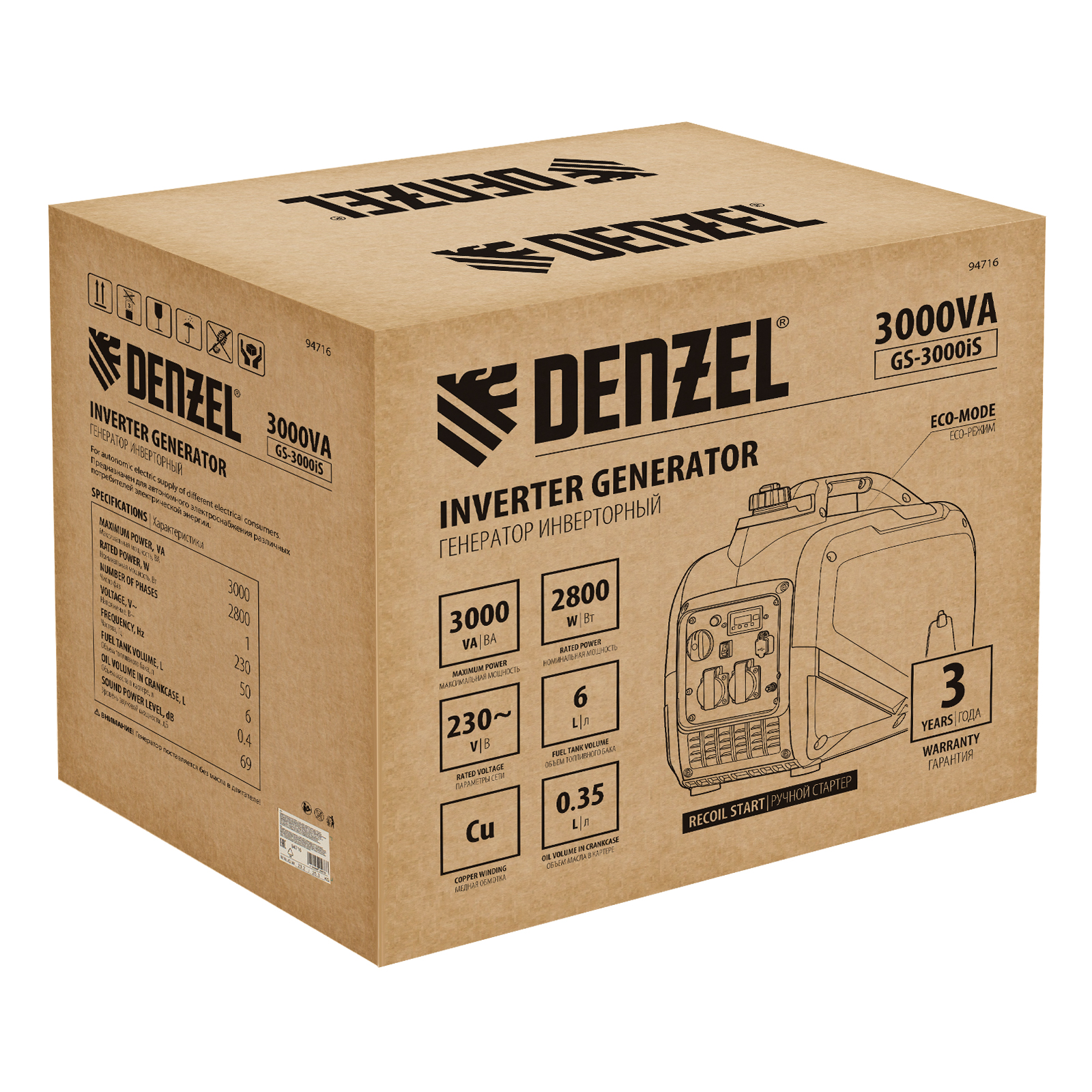 Генератор инверторный GS-3000iS, 3,0 кВт, 230 В, закрытый корпус, ручной старт DENZEL