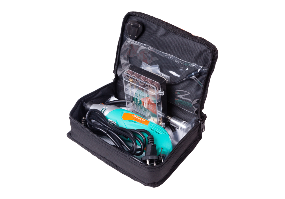 В комплекте с моделью поставляется расширенный диапазон из 120 аксессуаров, которые эргономично уложены в удобный кейс вместе с основным инструментом. Набор насадок включает в себя сверла, режущие насадки с головкой разнообразной формы, точильные аксессуары с наконечниками из абразивных материалов различной зернистости, цилиндрической, конусной, шарообразной или дисковой формы, щётки (крацовки), полировальные круги с матерчатым или войлочным материалом, небольшие отрезные диски и т. д.