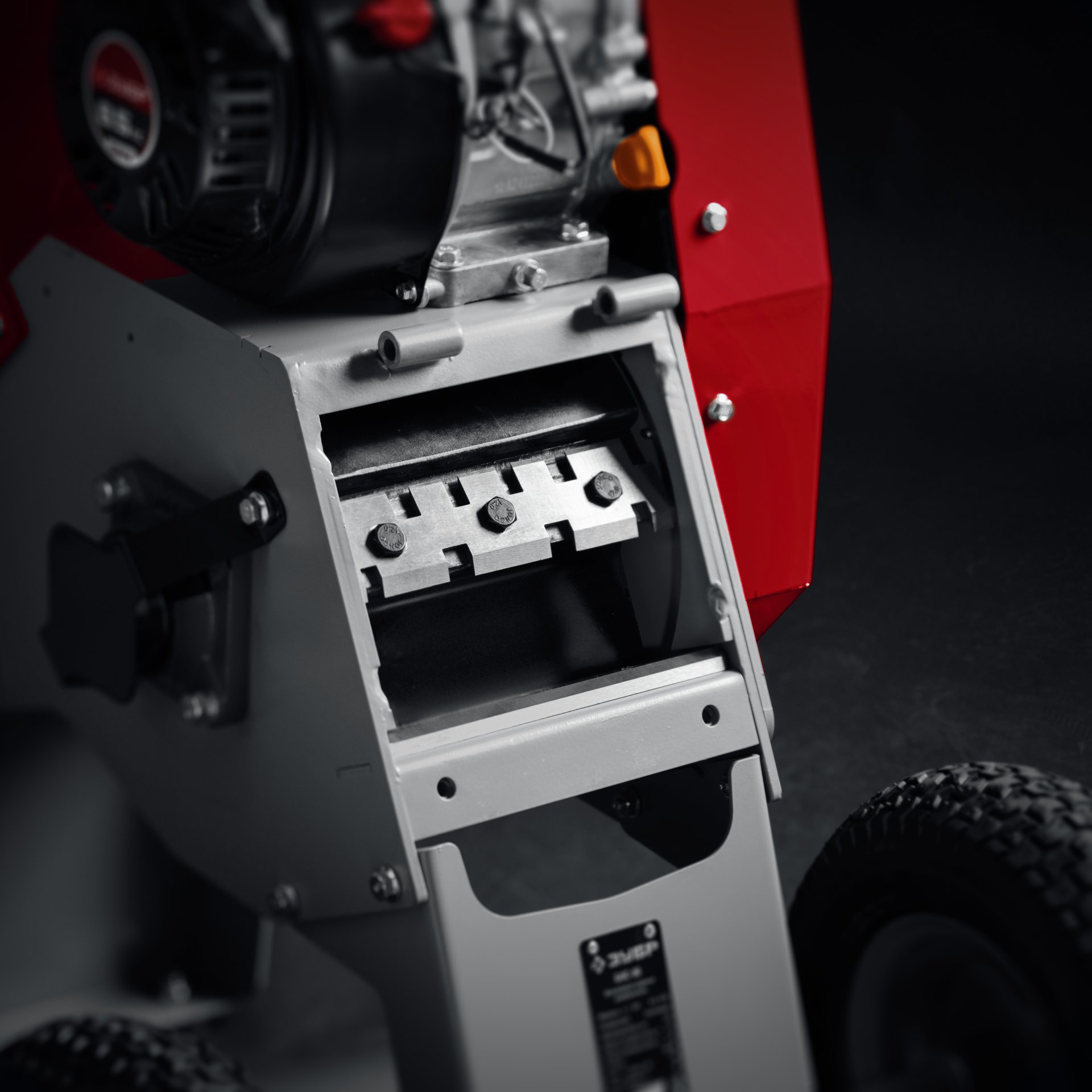 - Широкая горловина загрузочного желоба облегчает загрузку необработанной ветвистой древесины