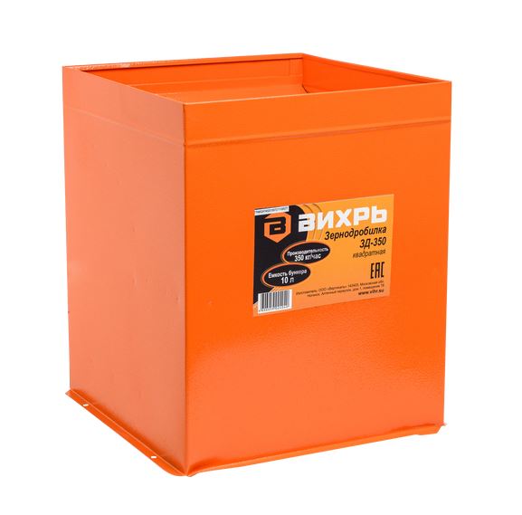 Зернодробилка ВИХРЬ ЗД-350 с однофазным коллекторным электродвигателем состоит из трёх элементов: загрузочной камеры, камеры измельчителя и моторного отсека. Тип бункера квадратный, его ёмкость составляет 10 л. Измельчитель зерна дробит сырьё на мелкие фрагменты при помощи лезвий, а затем пробивает его через сито. Частота вращения ножа: 12000 об/мин.