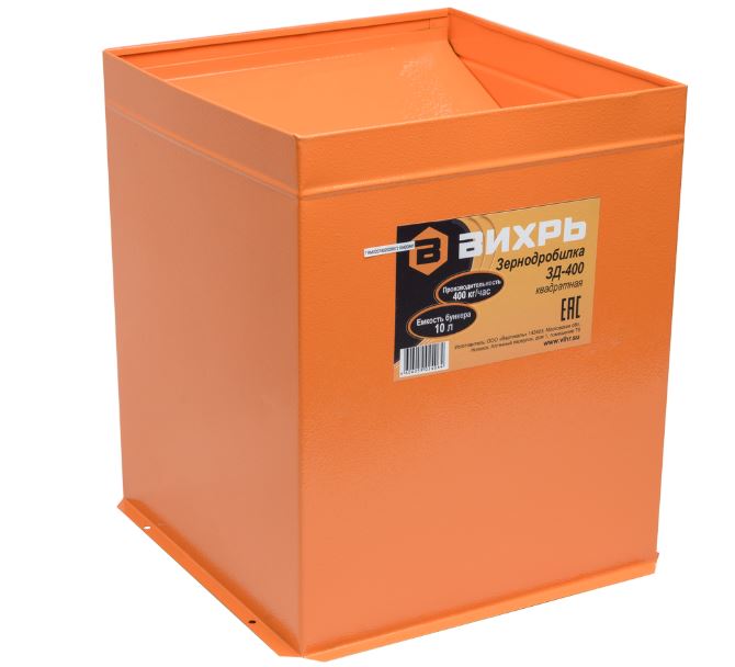 Измельчитель зерна ВИХРЬ ЗД-400 - модель зернодробилки повышенной производительности для личного подсобного хозяйства и фермерских хозяйств среднего размера. Применяется для дробления сухих сыпучих кормов для сельскохозяйственных животных: фуражного зерна, масличных культур, травяных гранул, комбикорма и т.д.