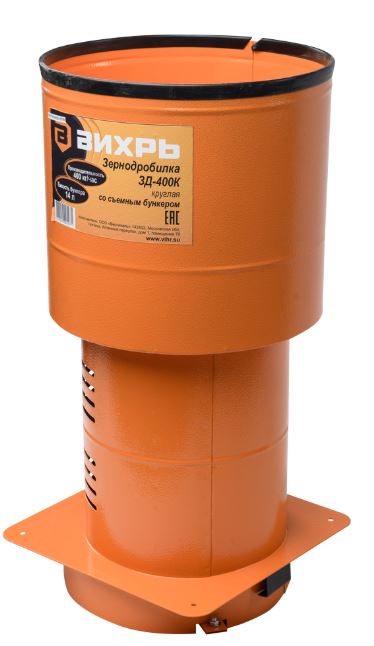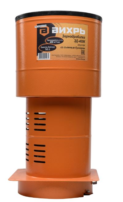 Измельчитель зерна ВИХРЬ 3Д-400К не нуждается в специальном обслуживании, но периодически необходимо проверять на износ ножи и сито, а также очищать от мучной пыли зернодробилку и ее основные части. Конструкция отличается меньшим весом, а для удобства транспортировки предусмотрена возможность отсоединения бункера для загрузки зерна от корпуса.