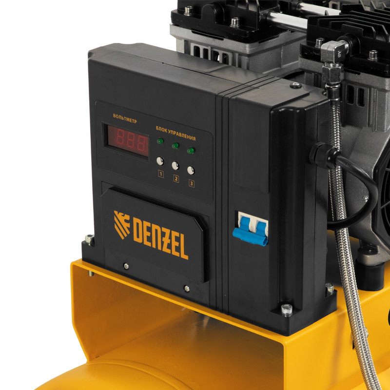Безмасляный малошумный компрессор Denzel DLS 2550/100 с блоком управления, мощностью 2250 (3 х 750) Вт, объемом ресивера 100 л и производительностью 410 л/мин предназначен для обеспечения пневмоинструмента сжатым воздухом, подаваемым под давлением до 8 бар. Позволяет подключить пневматический заклепочник, дрель, шлифмашину и т. д. Оптимален для работы с краскопультом и для продувки электронных компонентов, т. к. в сжатом воздухе отсутствуют частицы масла. Компрессор пригодится в мастерской, гараже, на строительной площадке.